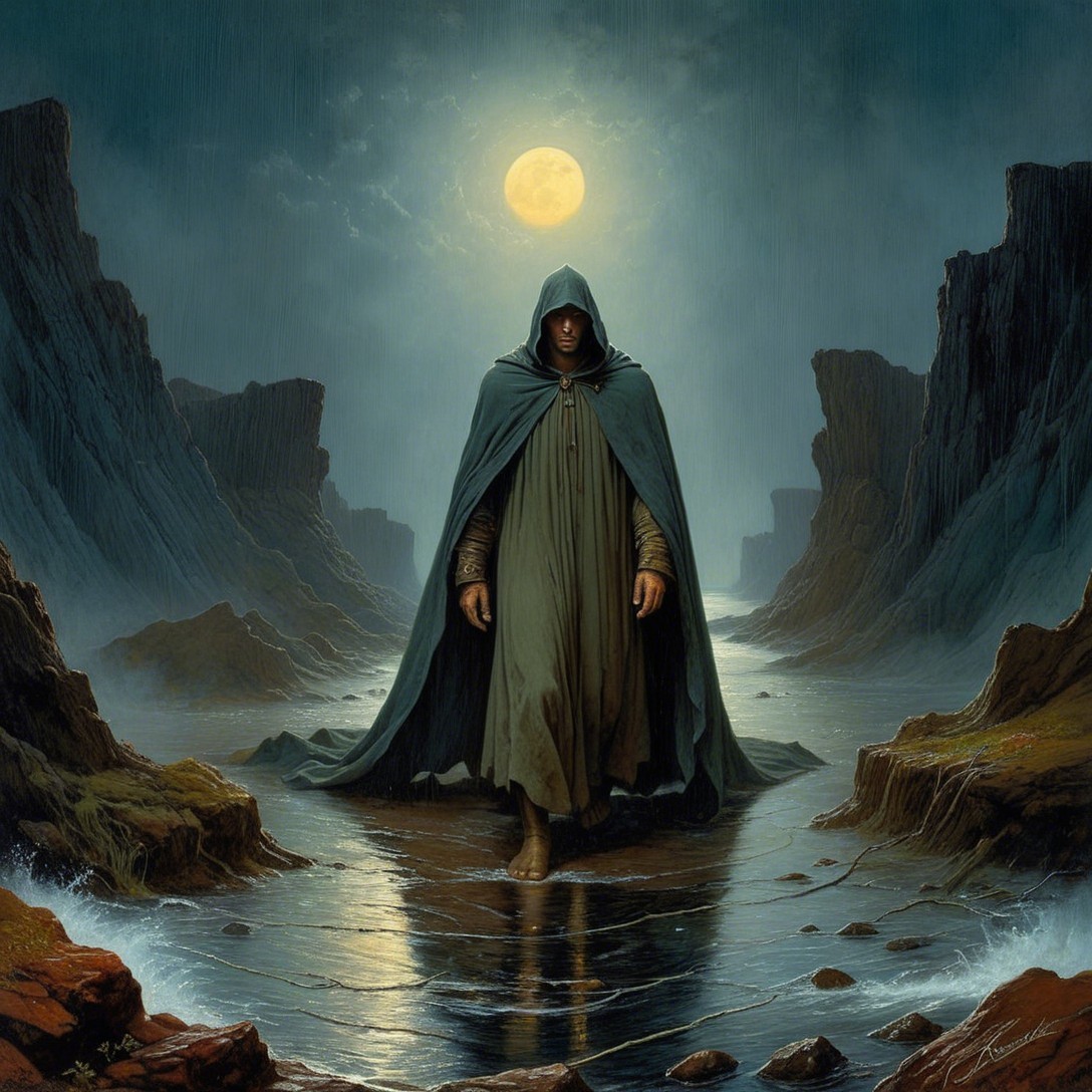 A cloaked figure walks through a misty landscape, illuminated by a full moon. Jagged cliffs rise around a reflective waterway, creating an eerie yet majestic atmosphere.