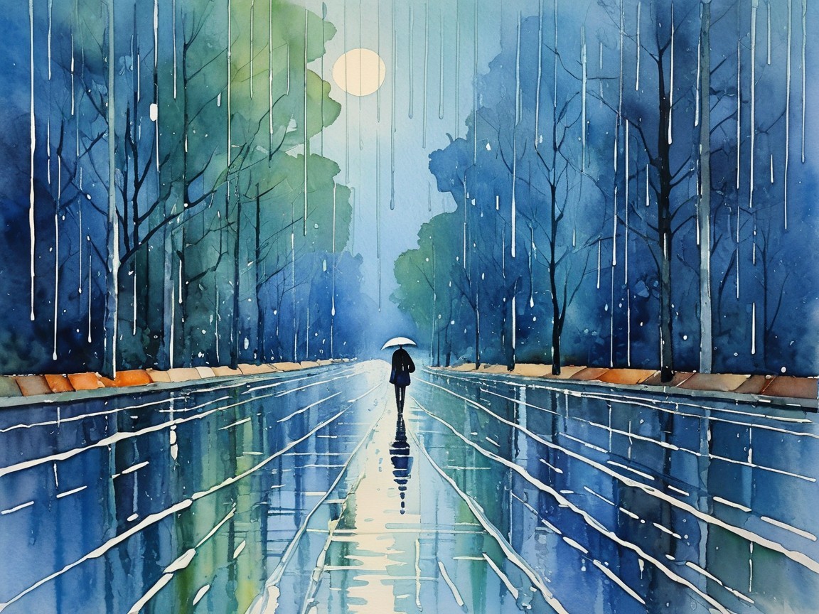Watercolor Scene of Figure Walking in Rain