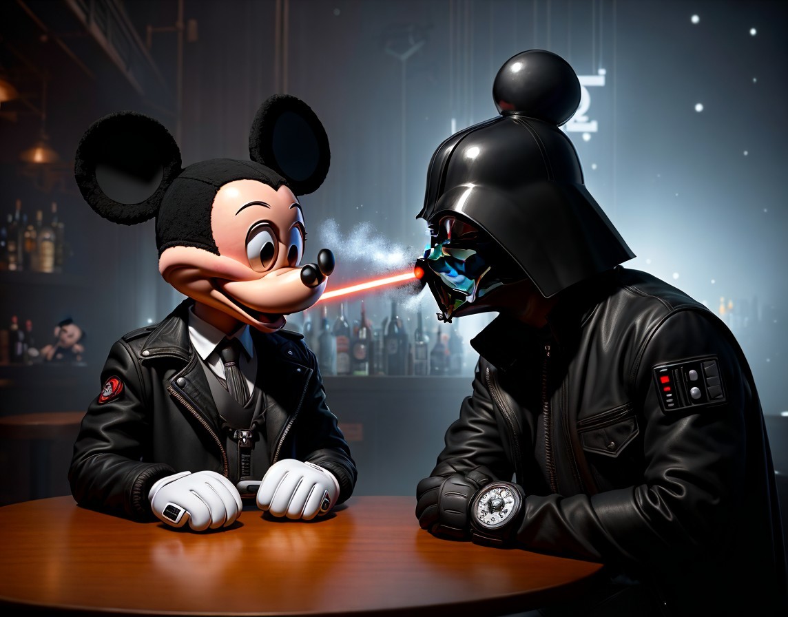 Prompt: Darth Vader integrating Mickey Mouse at a bar by Ashley Wood. remove dark Vader's Mickey Mouse ear. Enki Bilal, Daniel Gerhartz, cyberpunk" upon a background of crushed charcoal, in a stipple pattern.