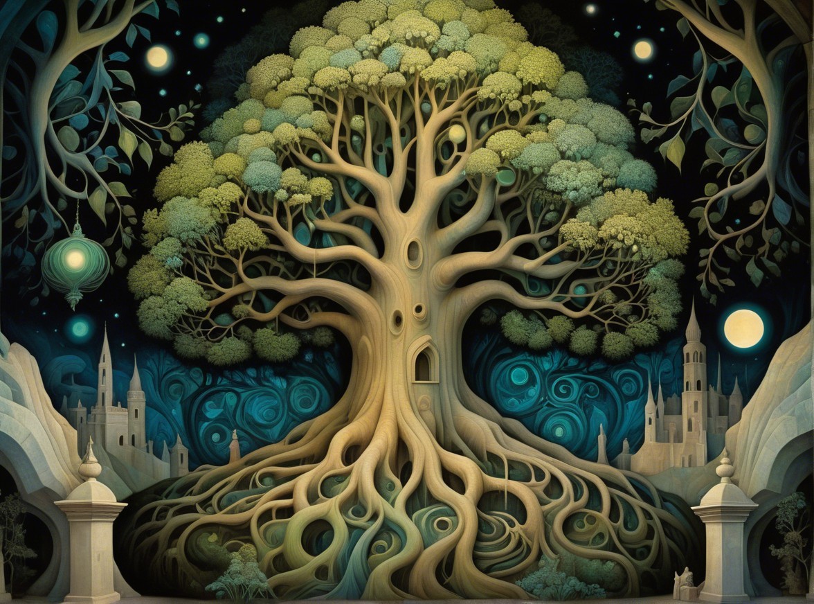 A majestic tree with intricate branches and roots fills the scene, set against a mystical night sky. Surreal castles rise in the background, enhancing the enchanting atmosphere.