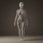 A stylized humanoid figure adorned with intricate body art, featuring elaborate patterns covering its skin. The figure stands confidently in a minimalist, shadowy environment.