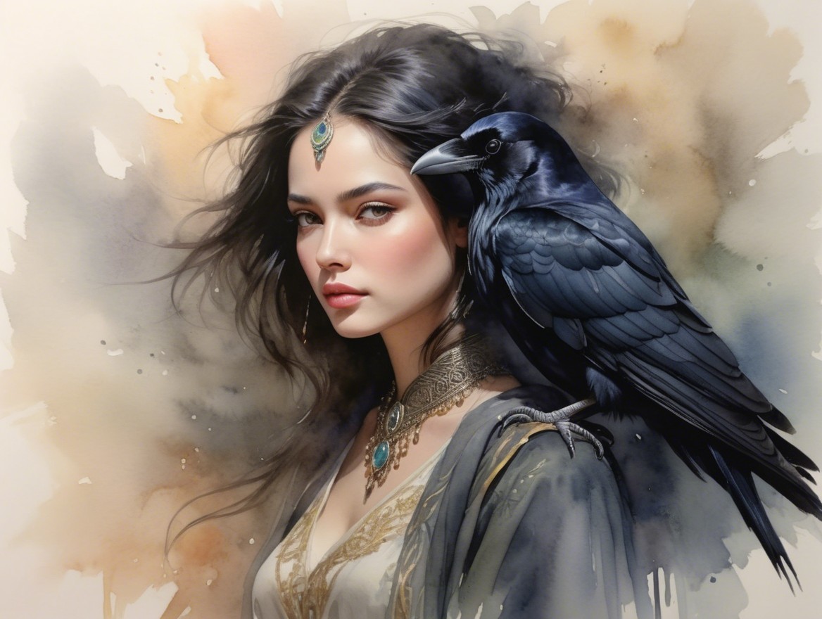 A mystical woman with flowing dark hair adorned with a gemstone headpiece gazes thoughtfully. A black raven perches on her shoulder, set against a soft, ethereal watercolor background.