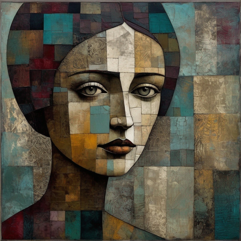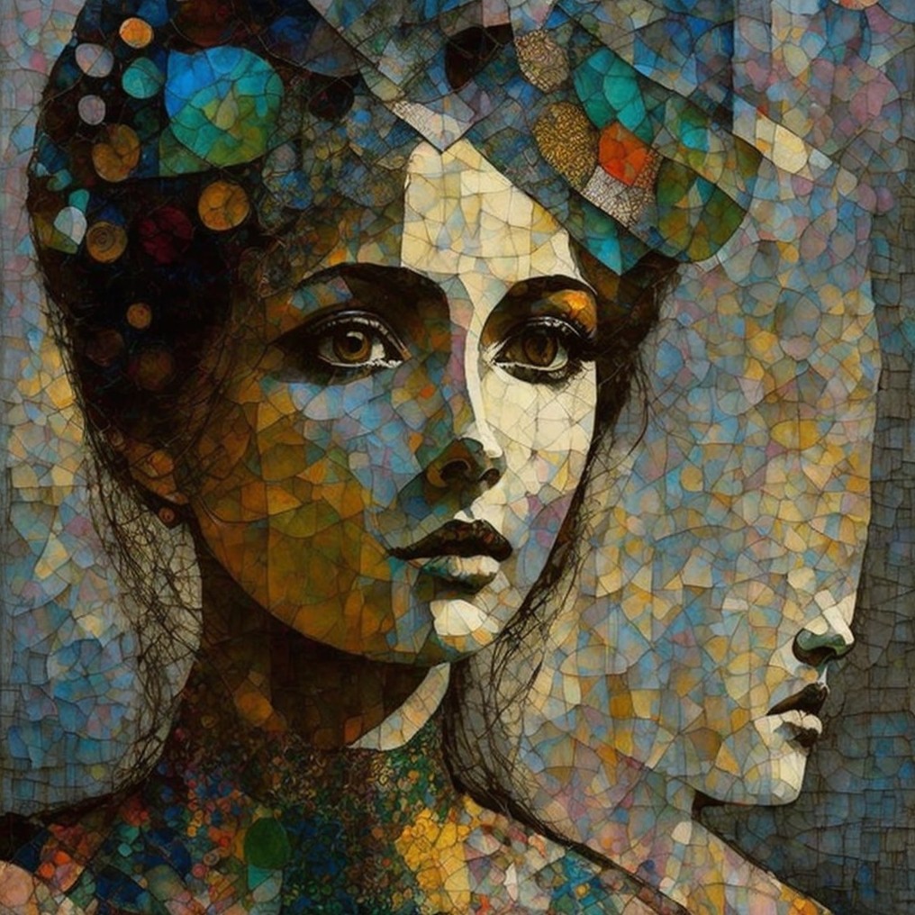 A portrait of a woman with a mosaic-like, multicolored pattern on her head and clothing, displaying a solemn expression.