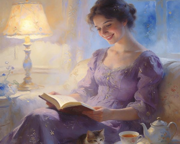 A serene scene features a woman in a flowing green dress, holding golden wheat. Vibrant flowers surround her, and a distant castle rises amidst a colorful, dreamy backdrop.