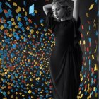A woman in a sleek black blazer stands in front of a vibrant, abstract mural, featuring colorful shards against a dark background, creating a mesmerizing sense of depth and motion.