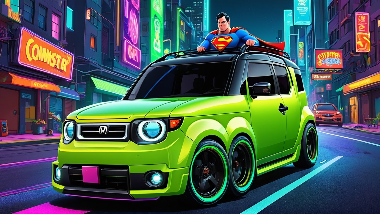 Prompt: "Vibrant neon cityscape, cartoon monster character, psychedelic Superman costume, "RGAP" on the shirt, driving a light green Honda Element, futuristic city buildings, glowing neon signs, bustling streets, colorful graffiti, quirky character design, whimsical cartoon style, bold outlines, bright and contrasting colors, dynamic composition, urban setting, digital illustration, high energy, playful and surreal atmosphere, by a mix of Jim Henson and Hayao Miyazaki, Behance."