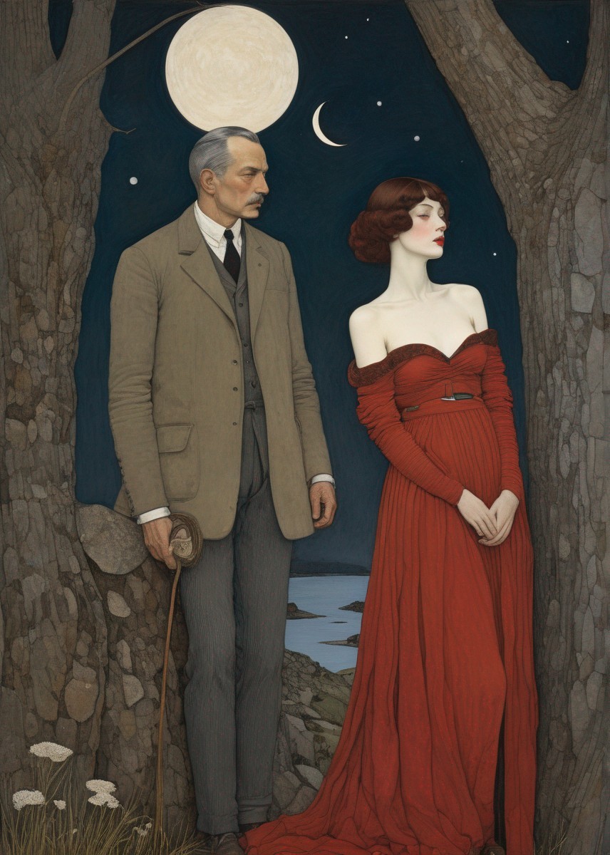 A woman in a red cloak stands before a cottage at night, with a full moon and stars above amidst bare trees.