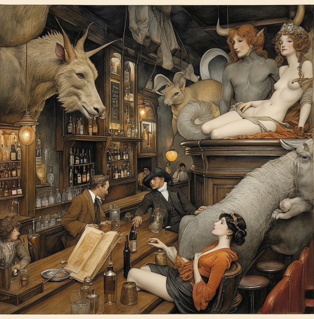 In a cozy, vintage bar, a woman with striking red hair chats intimately with a bartender. A platter of fruits and drinks decorate the wooden counter, while patrons linger in the background.