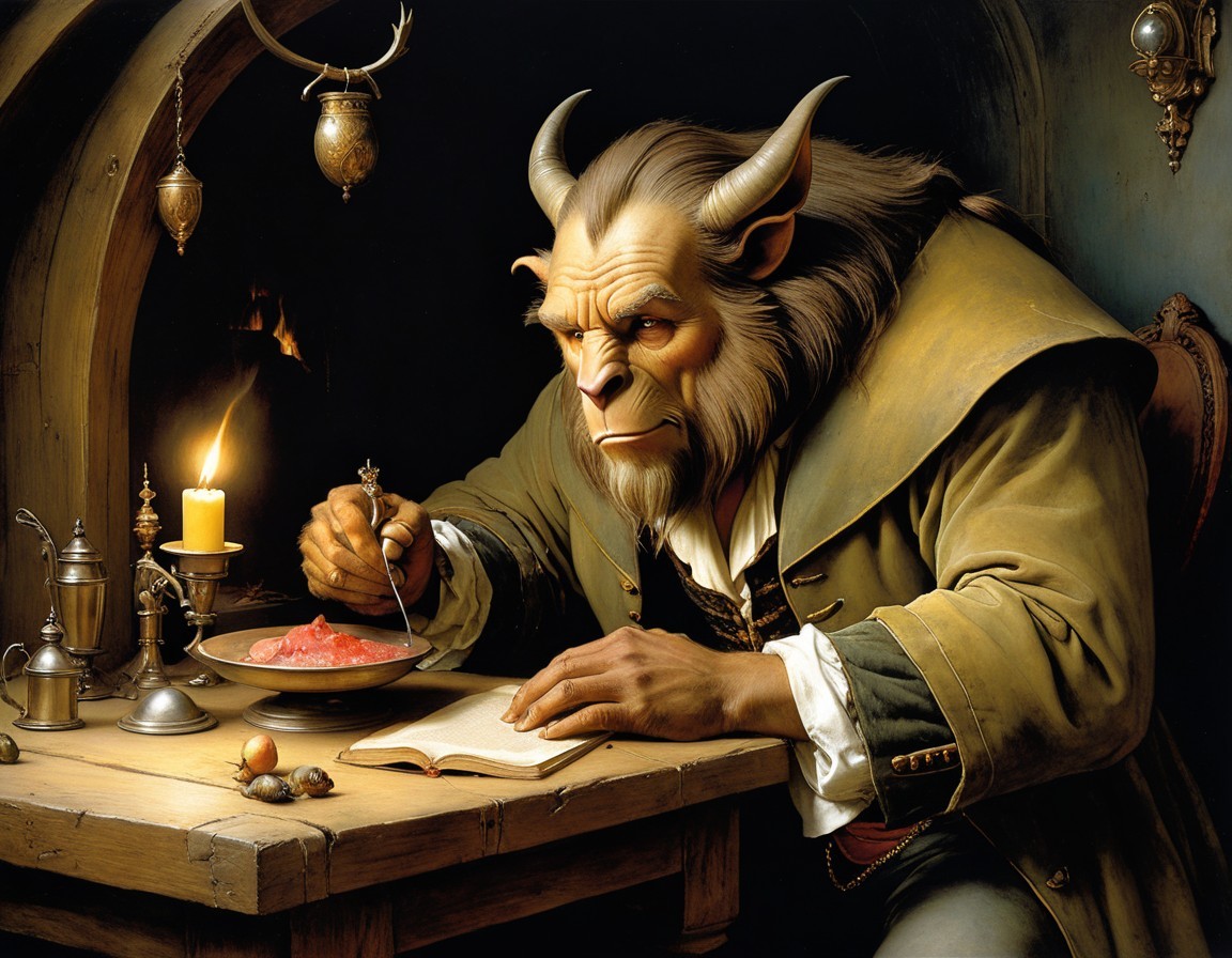 A painting of a scholarly fantasy creature with horns, dressed in renaissance attire, writing in a book and examining strawberries.