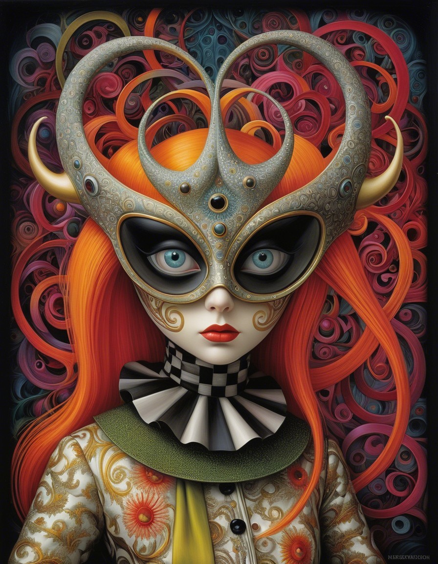 A whimsical girl with striking orange hair and a decorative mask featuring ornate horns. She wears a patterned outfit with a ruffled collar, set against a vibrant, swirled background.
