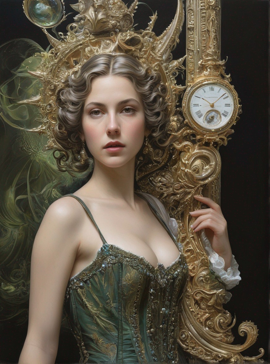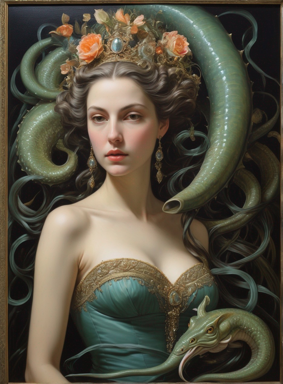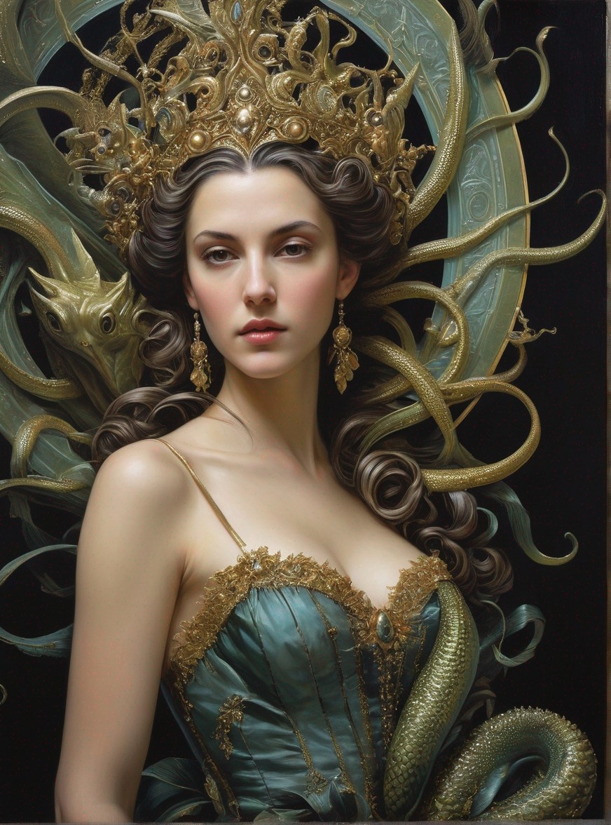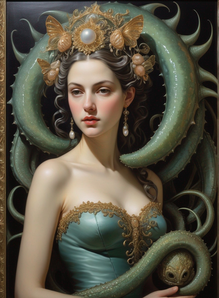 + Prompt:Lovecraftian fairytale. This artwork amalgamates the artistic styles of Lavinia Fontana and Sarah Goodridge, showcasing a harmonious fusion of their respective techniques. The painting exemplifies a seamless integration of Fontana's mastery of portraiture and Goodridge's delicate brushwork, resulting in a visually captivating composition that embodies the essence of both artists' unique contributions.