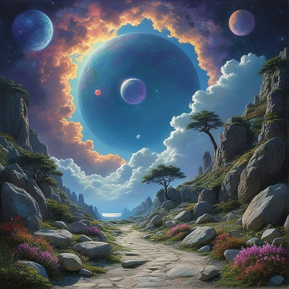 A vivid landscape features a winding path surrounded by rocky cliffs, colorful flowers, and vibrant clouds, leading to a stunning view of multiple planets in a starry sky.