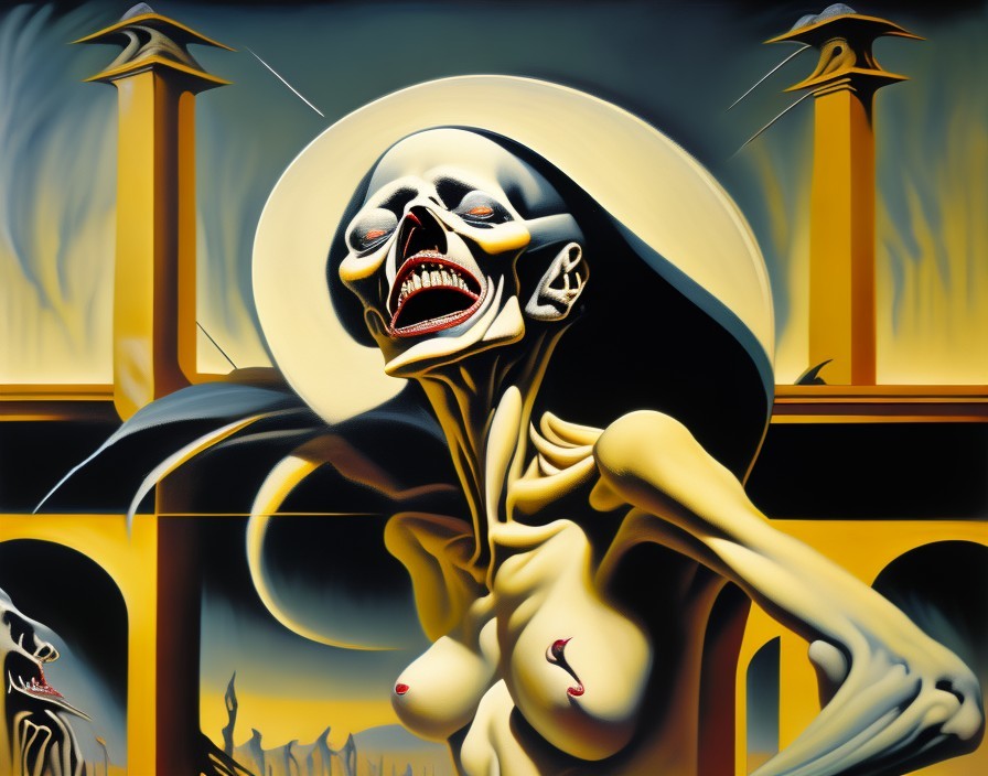 A stylized painting depicts a skeletal figure in a hat against a backdrop of colorful, surreal architecture and moon.