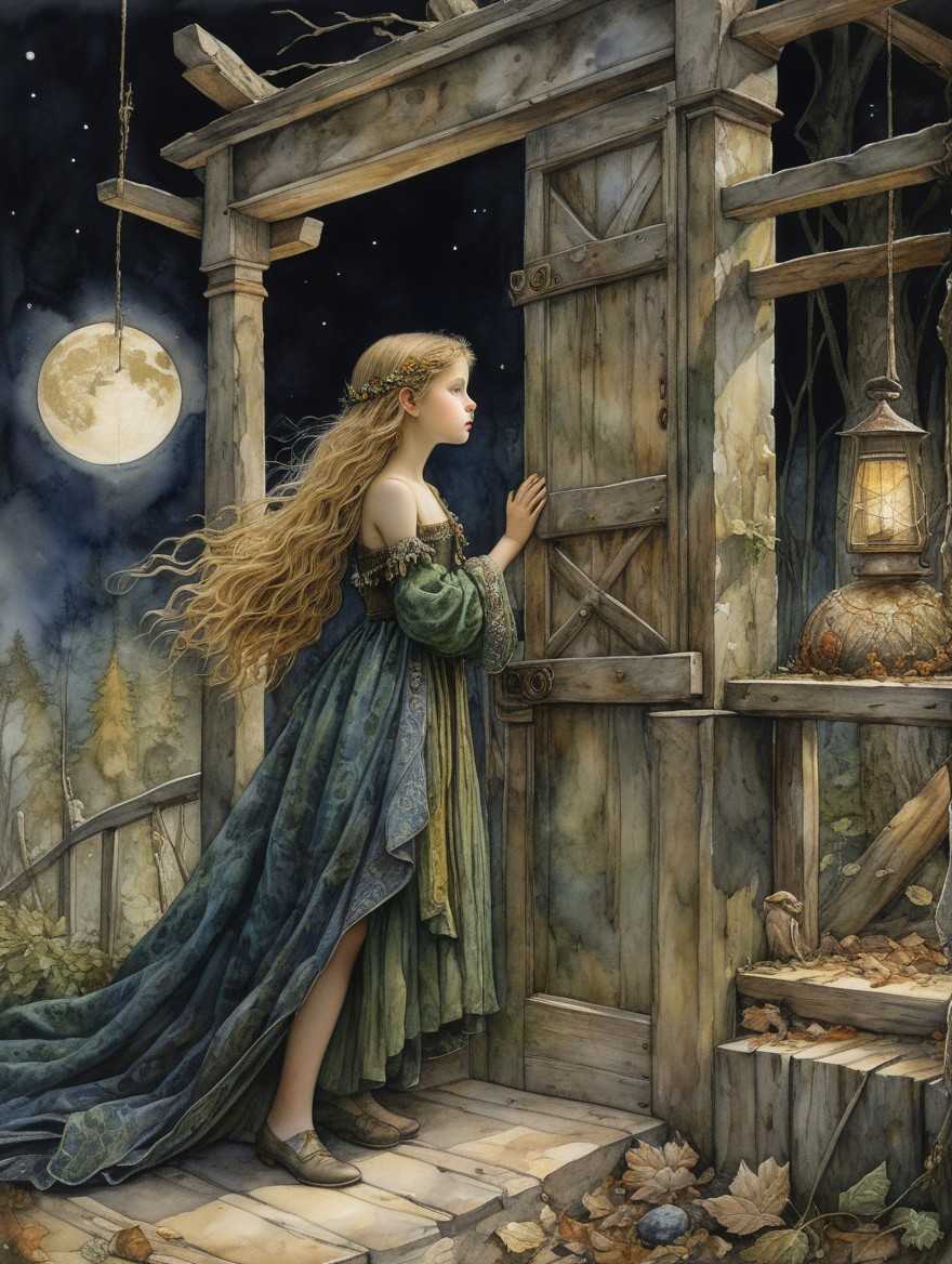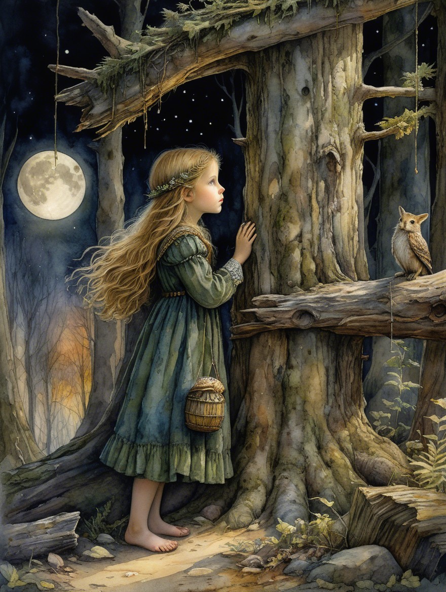 A serene girl with angelic wings stands by an ancient tree in a moonlit forest, clutching a basket. A curious fox watches nearby, creating a magical, whimsical scene.