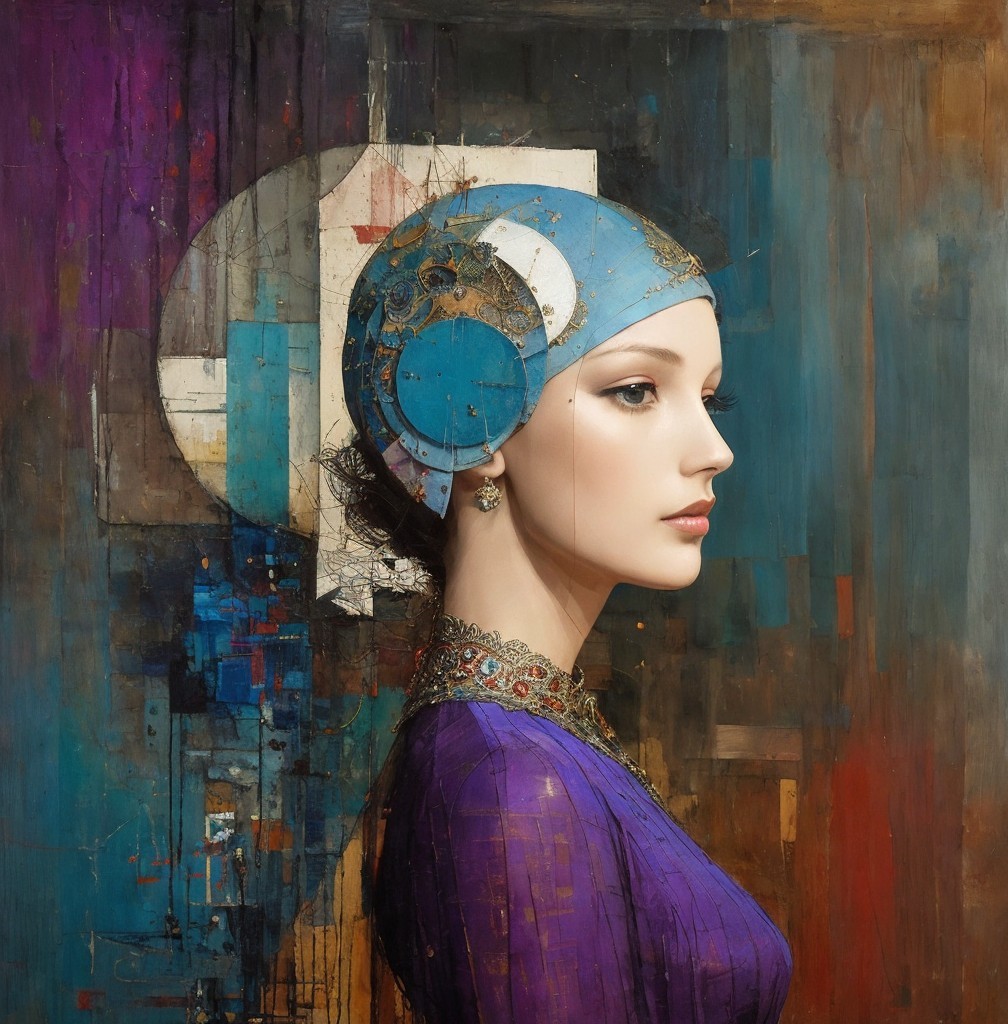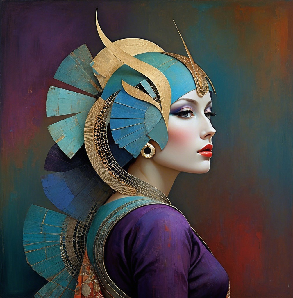 The image features a stylized portrait of a woman with a striking profile, adorned with vibrant colors and geometric patterns, complemented by elegant jewelry and a dramatic headdress.
