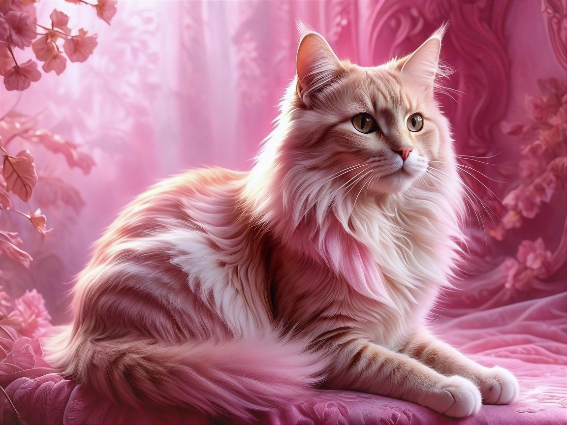 (Try from Simone C. v. R.) - A majestic long-haired cat with a creamy orange coat and soft pink highlights gazes serenely against a backdrop of delicate pink fabrics and blossoms, exuding elegance and tranquility.