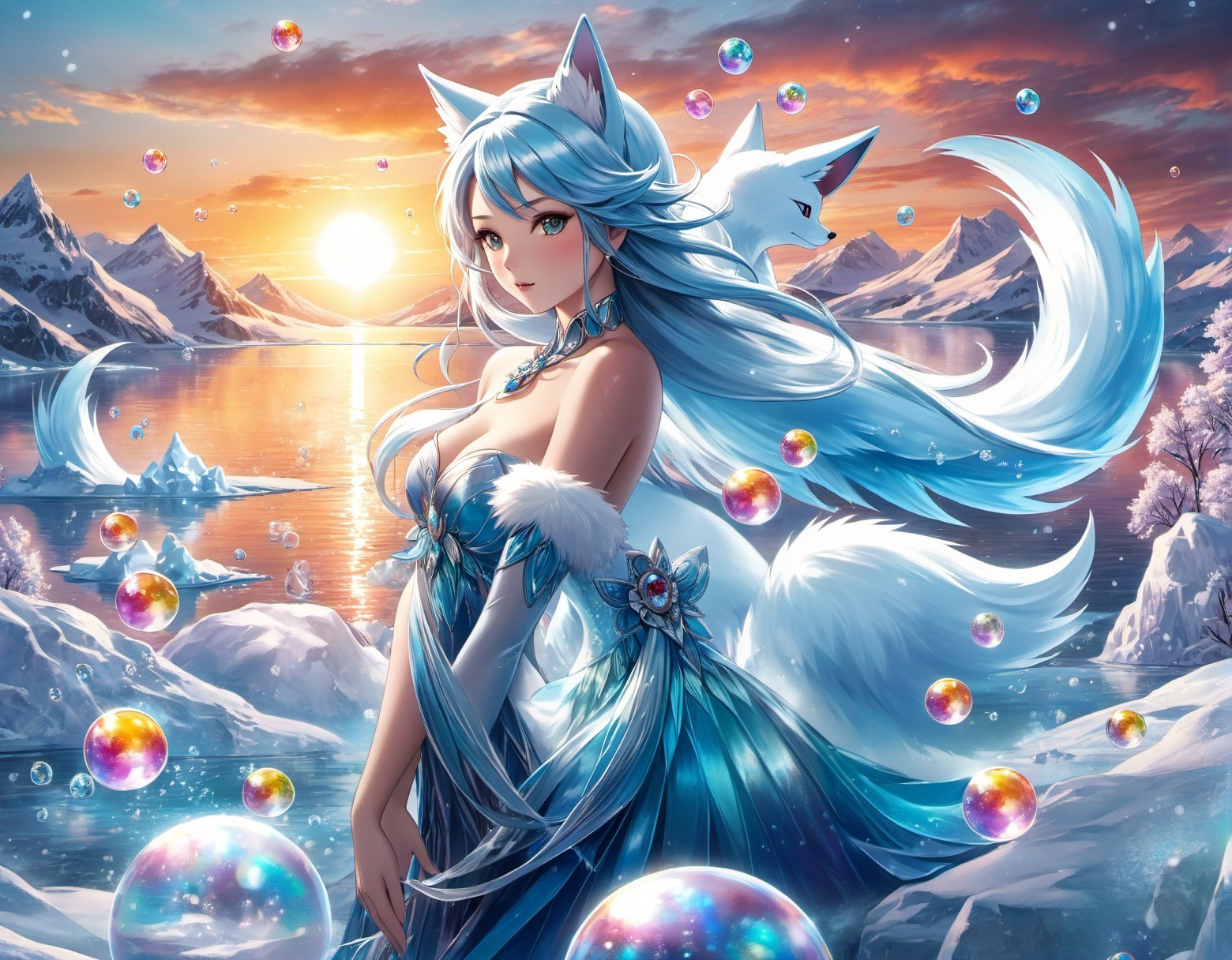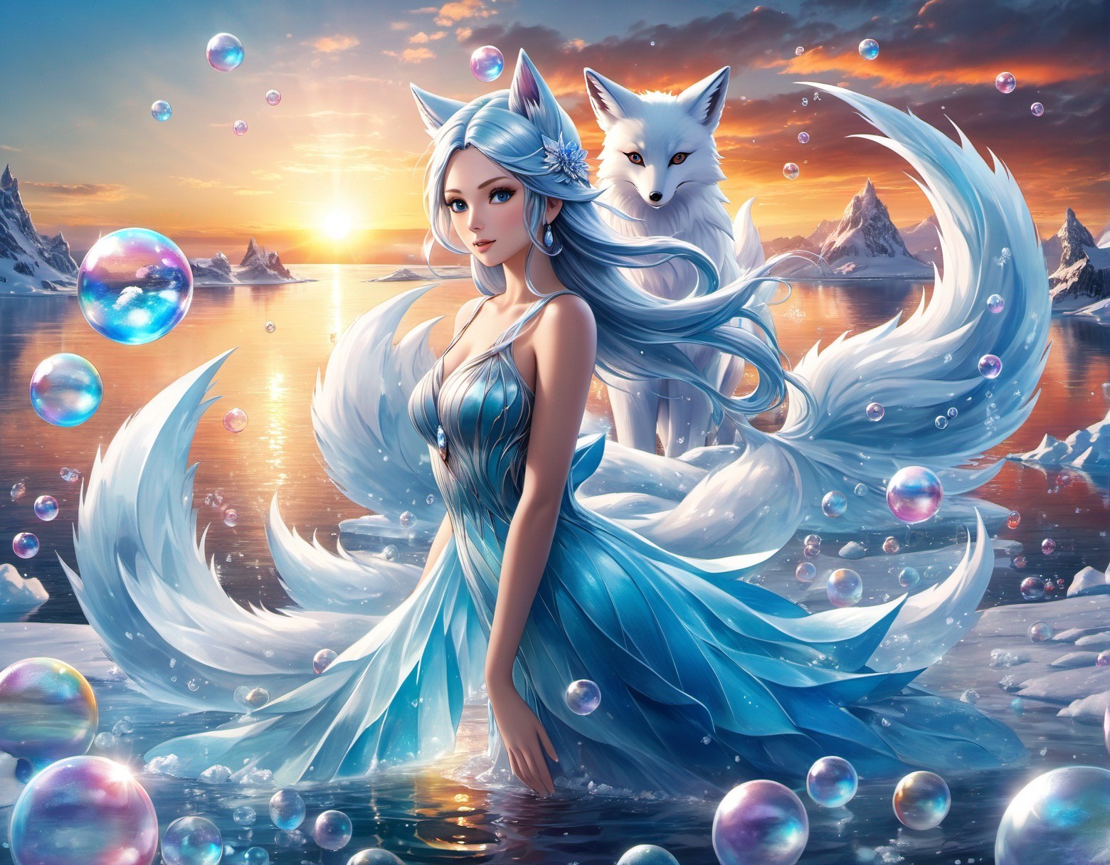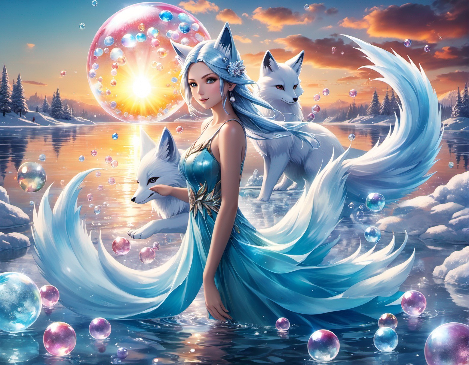 A fantasy scene with a majestic winged wolf, a woman in a flowing dress, and iridescent bubbles against a snowy mountainous backdrop and sunset.
