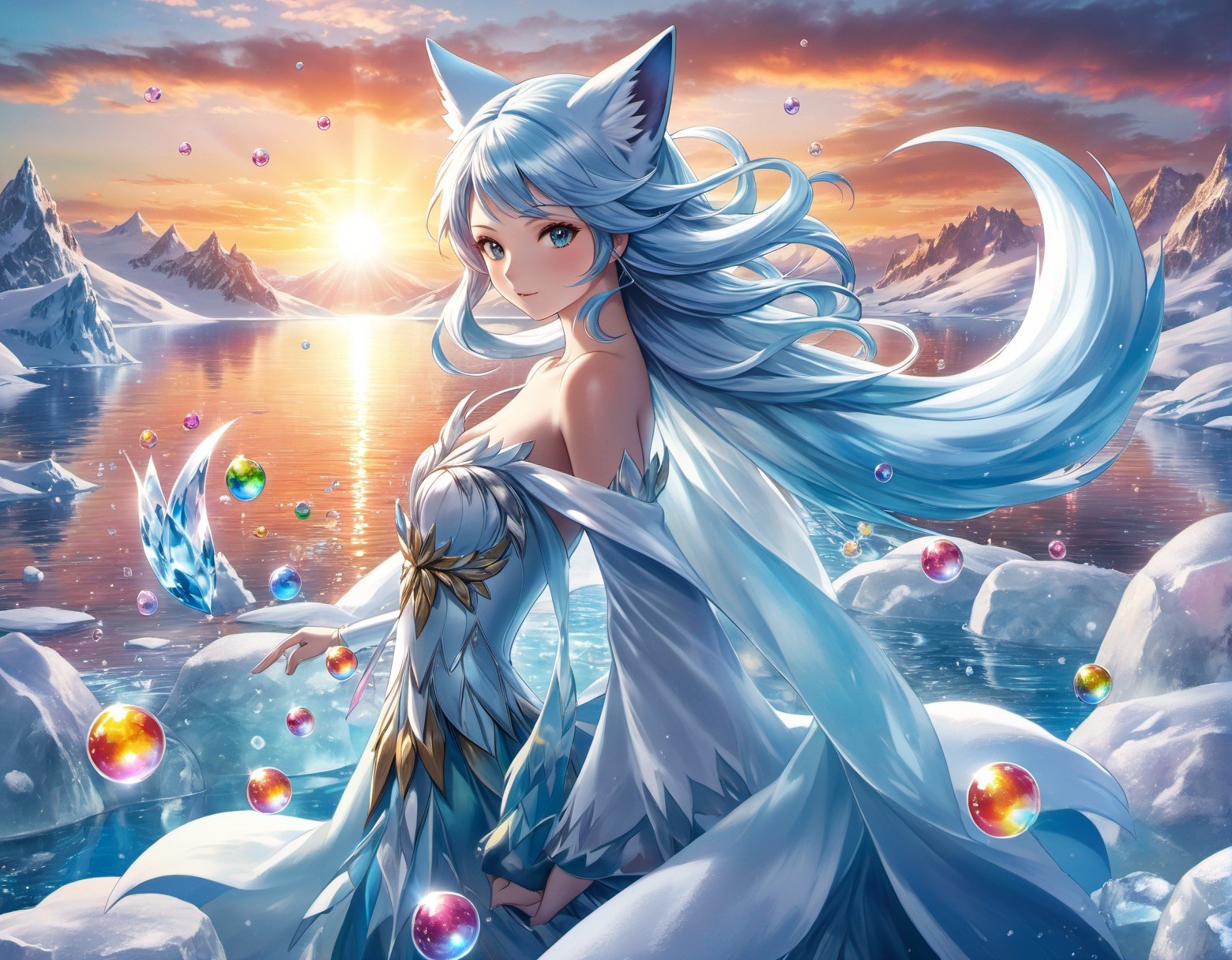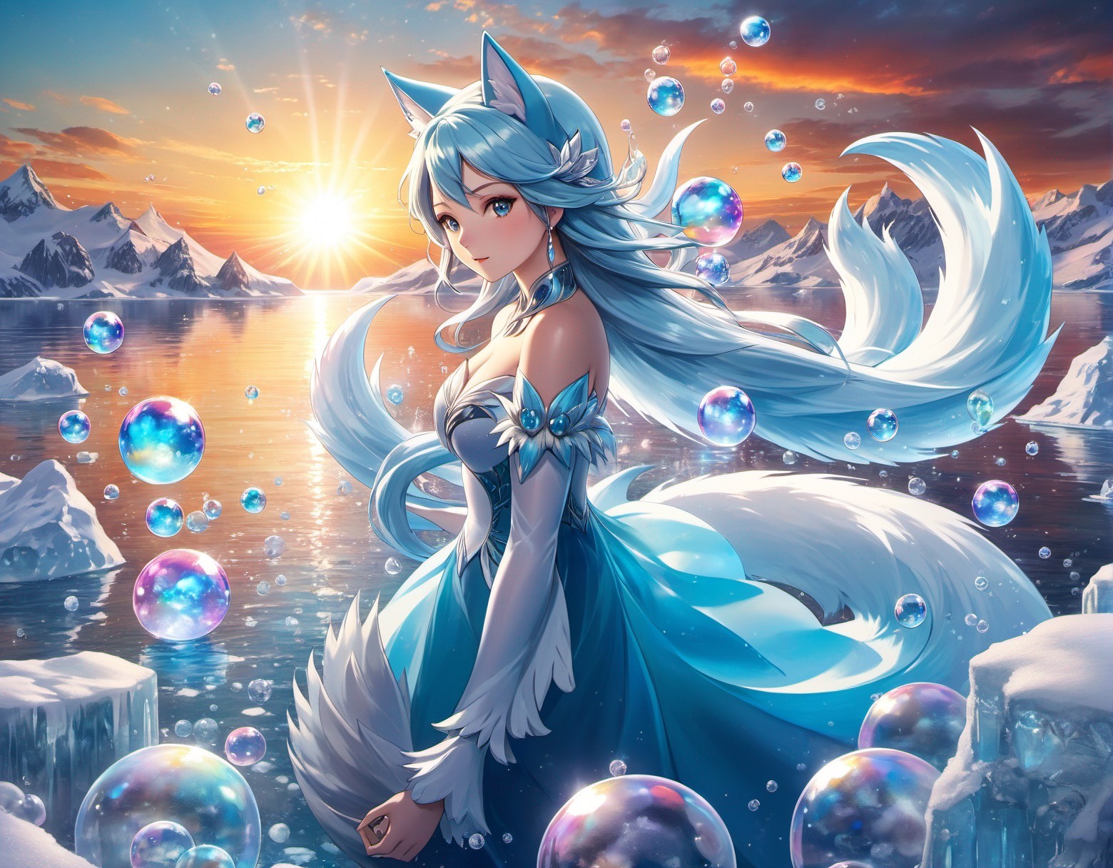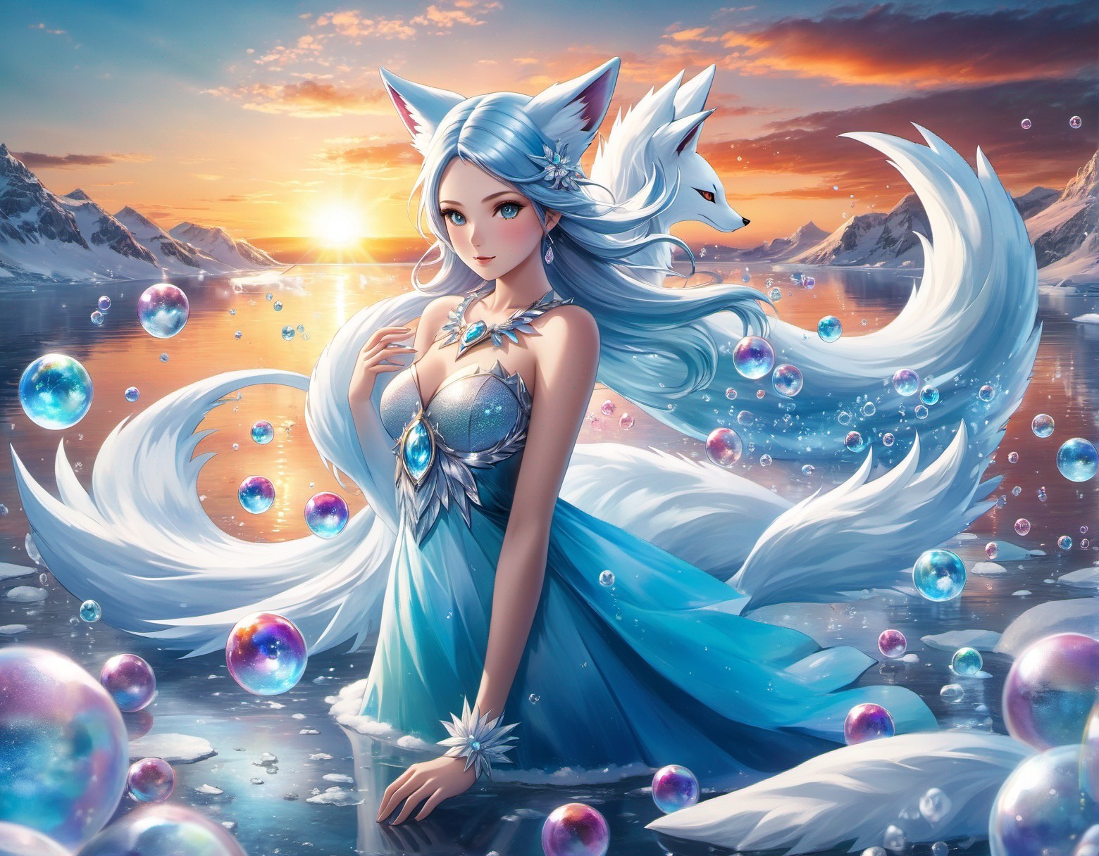 A fantasy scene with a majestic winged wolf, a woman in a flowing dress, and iridescent bubbles against a snowy mountainous backdrop and sunset.