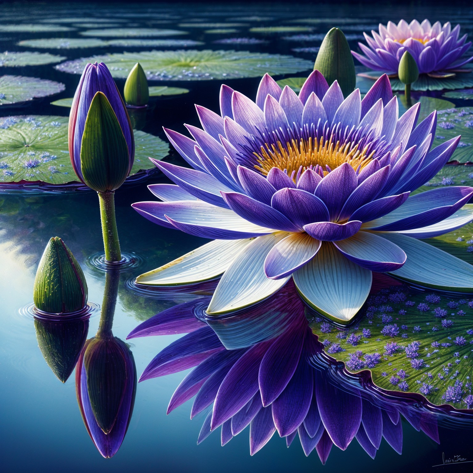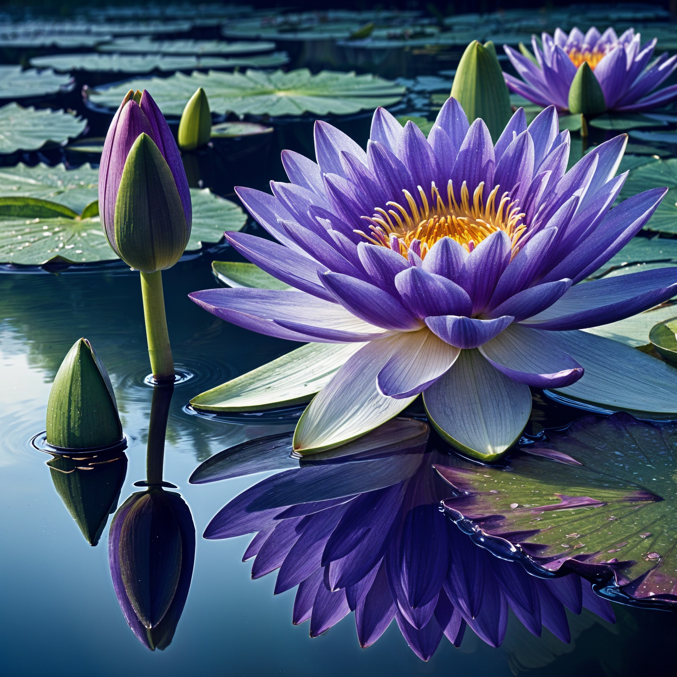 A stunning water lily blooms in vibrant purple hues, surrounded by lush green leaves. Its reflection shimmers on the tranquil water, complemented by a budding lily about to open.