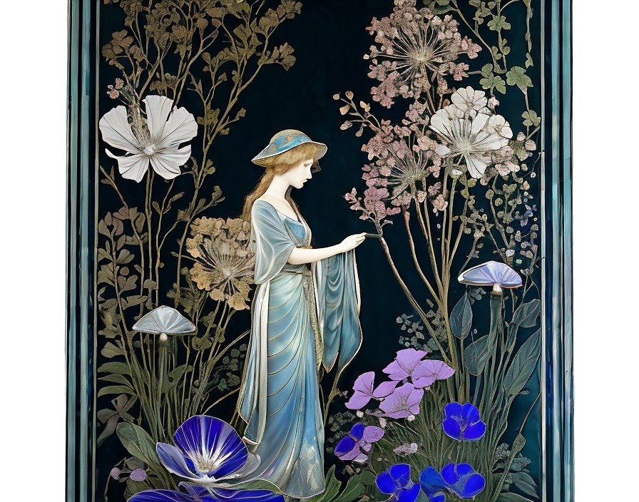 A painting of a woman in a flowing robe with a hat, standing among oversized flowers, holding a small object in her hands.