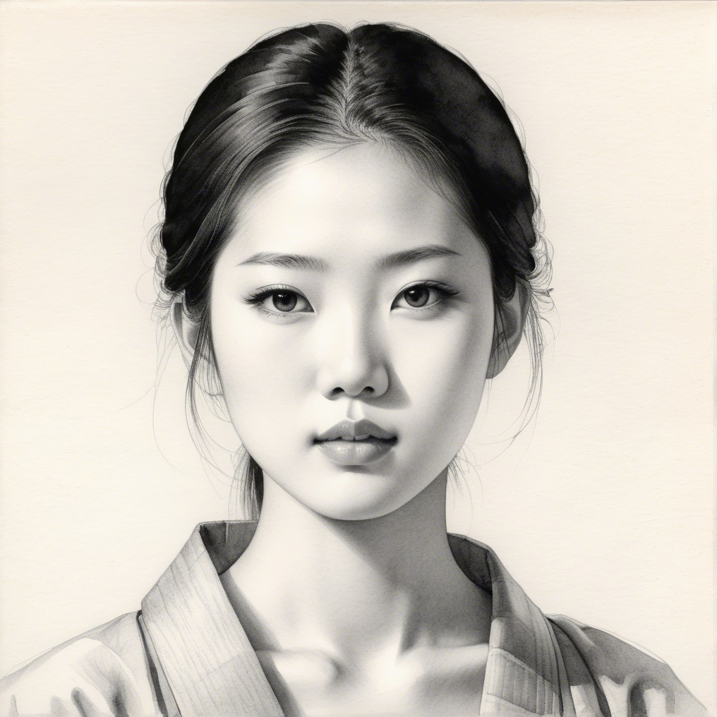 A detailed black and white portrait of a young woman with long hair, wearing a traditional garment. Her expressive eyes and serene expression create a captivating, calm presence.