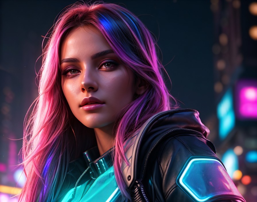 A digital portrait of a woman with pink-tinted hair and a leather jacket looks at the viewer. She is backlit by a neon nighttime cityscape. The image is styled to display cyberpunk and futuristic themes but is less dark in emotional tones.