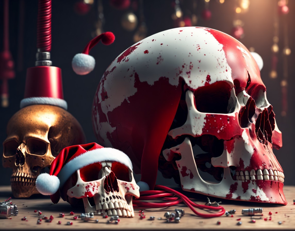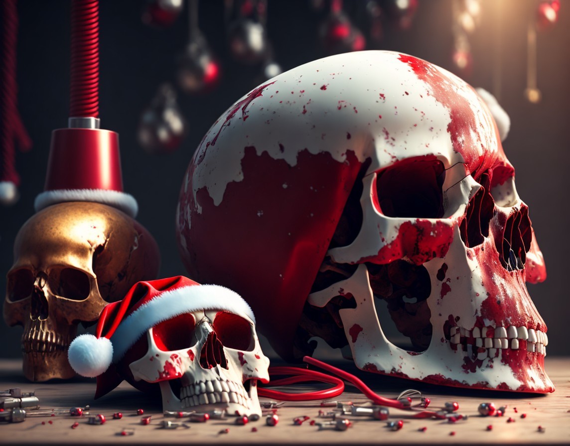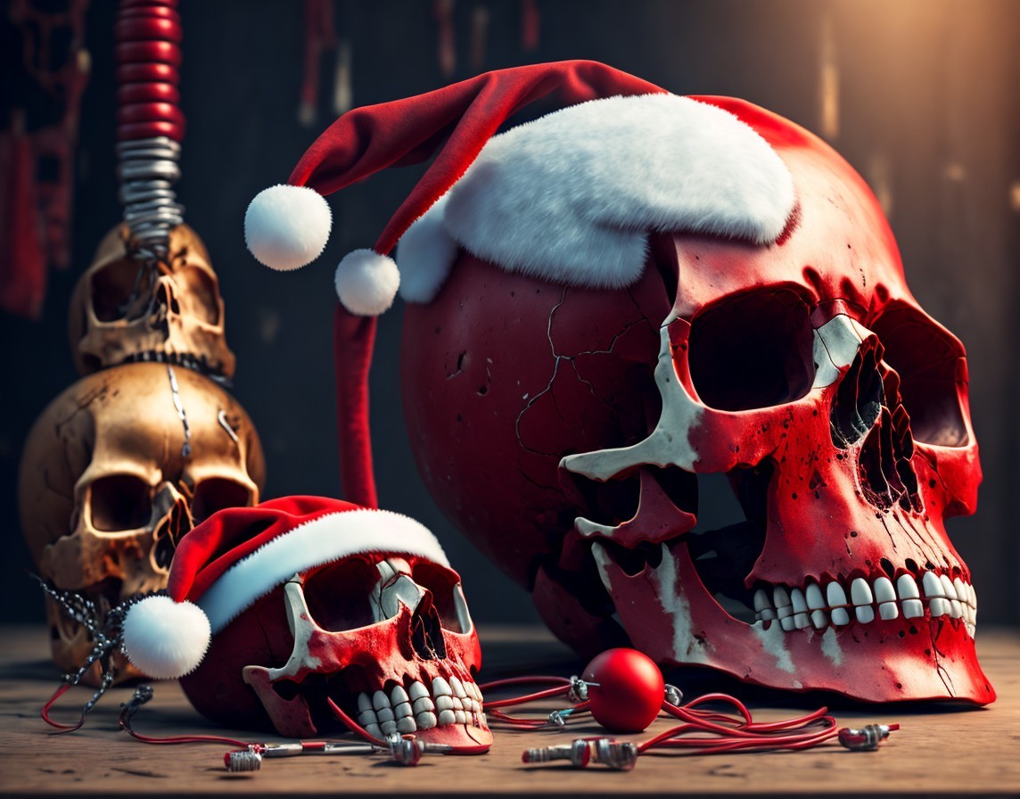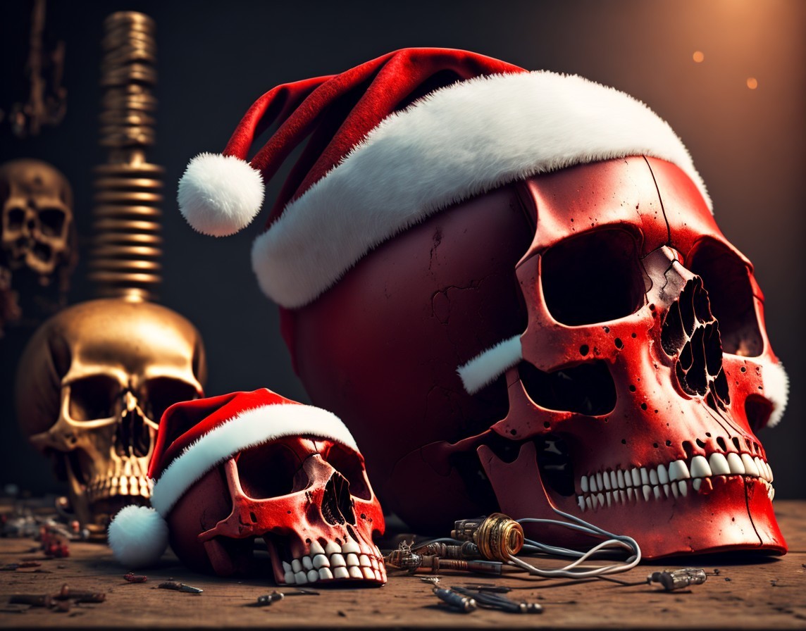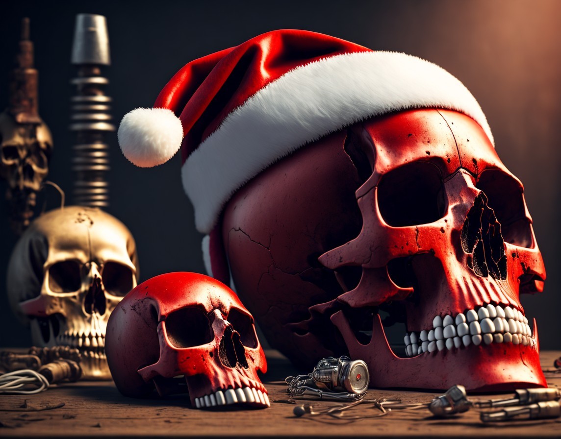 Prompt: A battered broken rusty dirty scratched Santa Claus android skull laying on the side on a table, red hat, white beard, cables sticking out of the neck, tools on the table, workshop