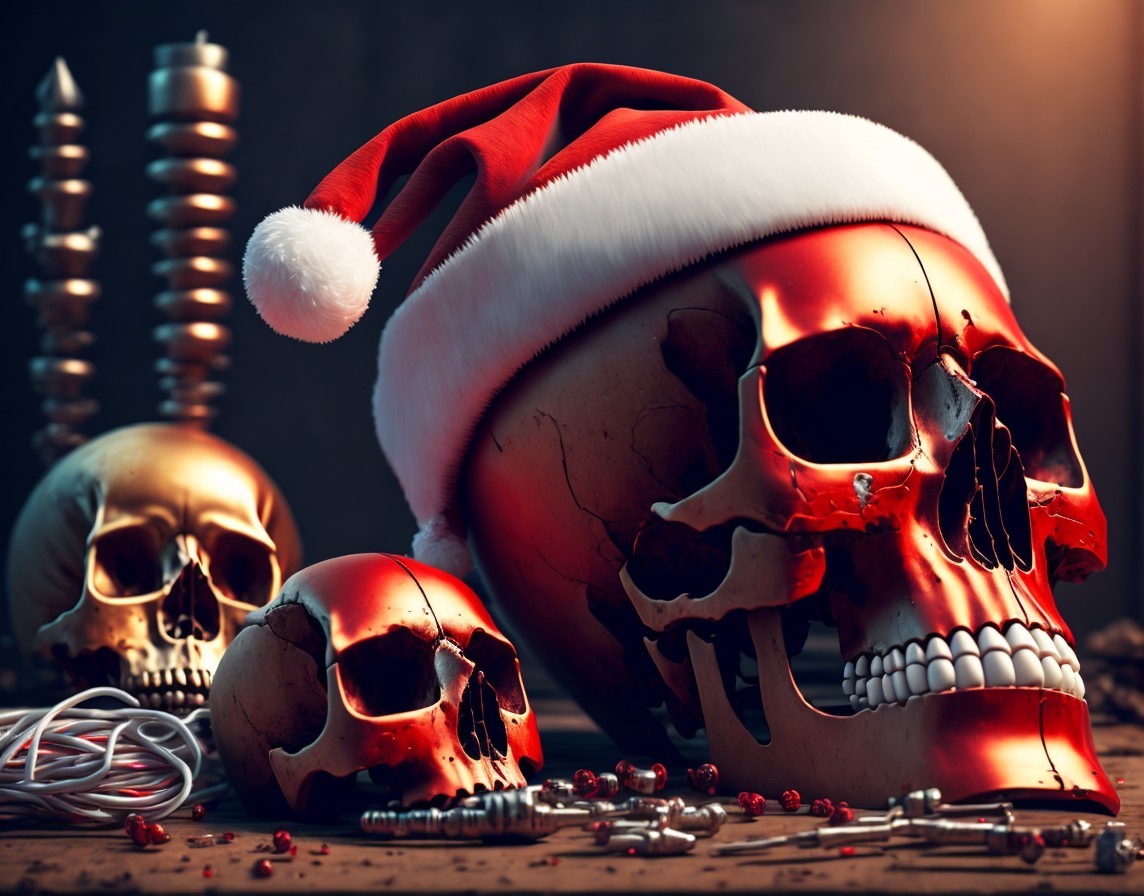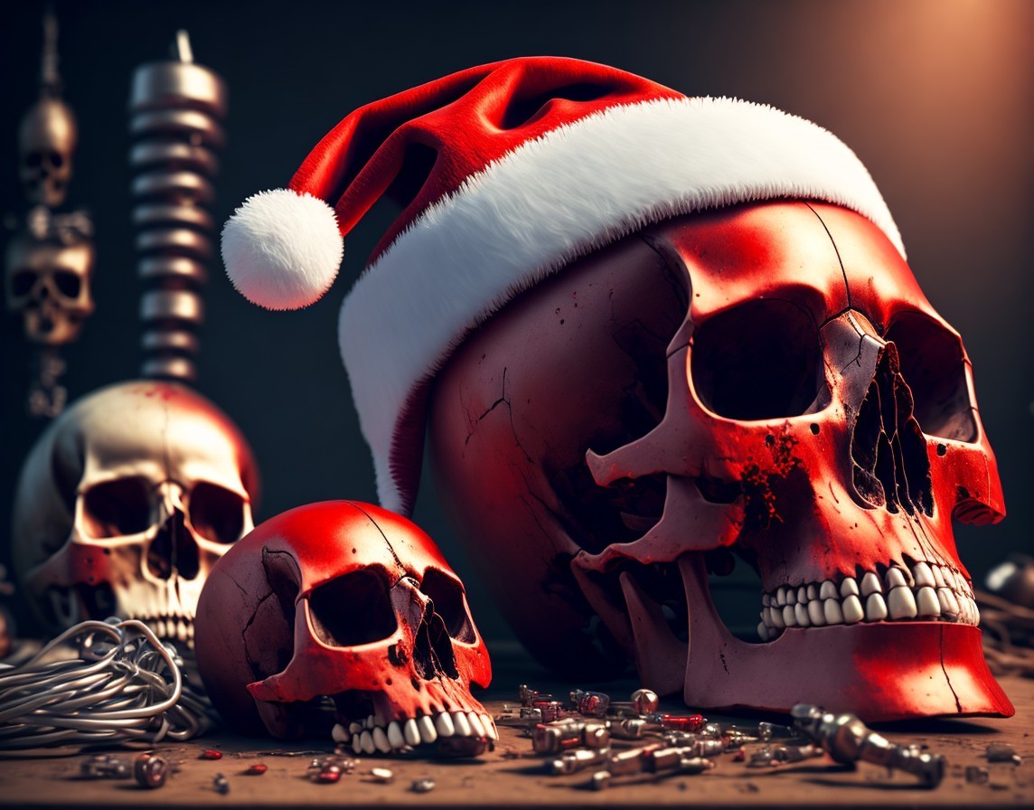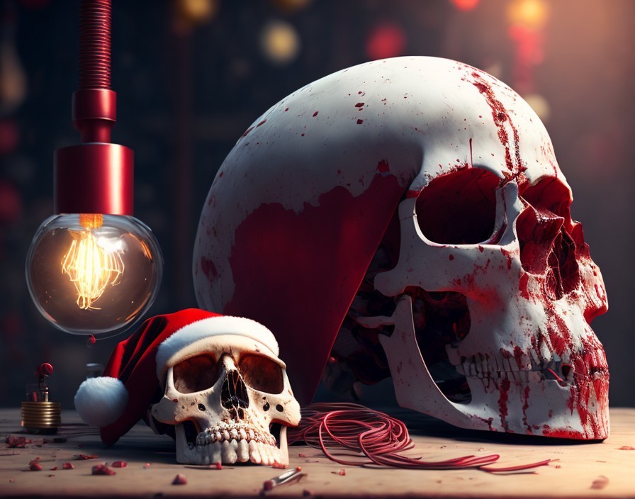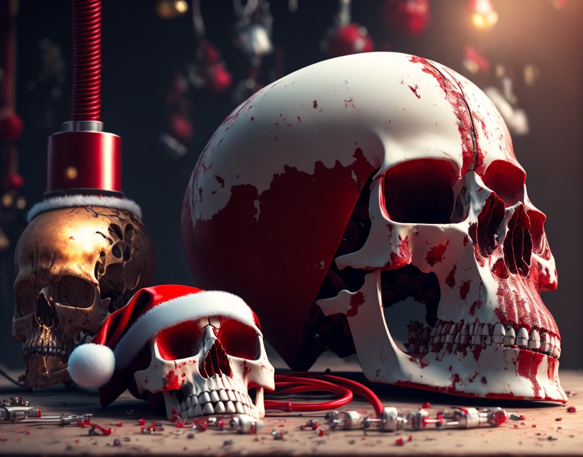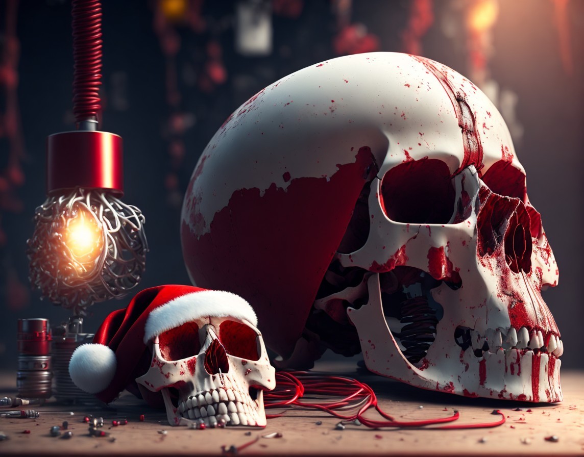 Prompt: "A battered broken rusty dirty scratched Santa Claus android skull laying on the side on a table, red hat, white beard, cables sticking out of the neck, tools on the table, workshop"