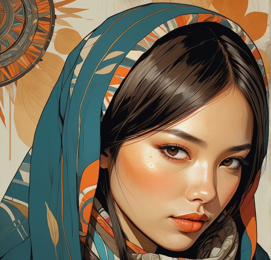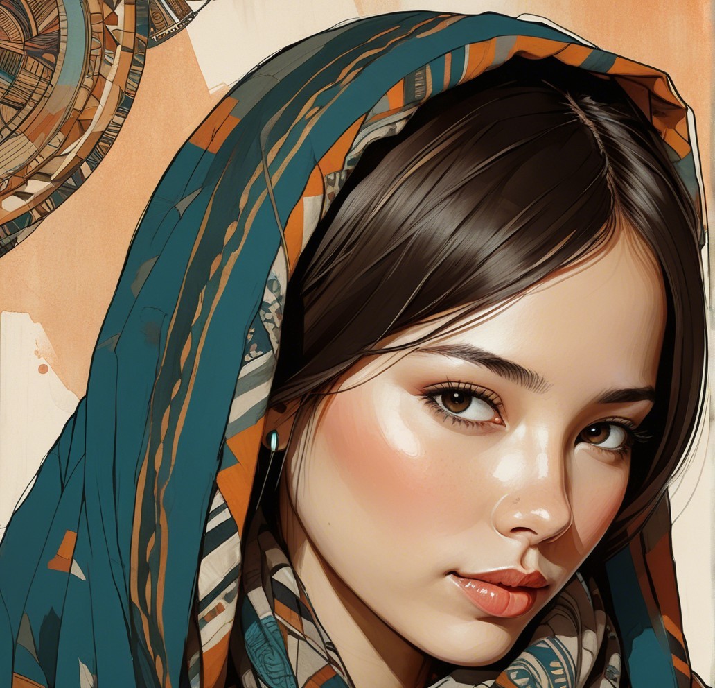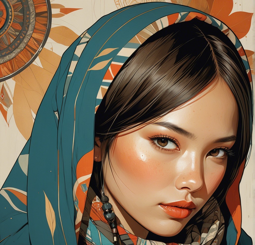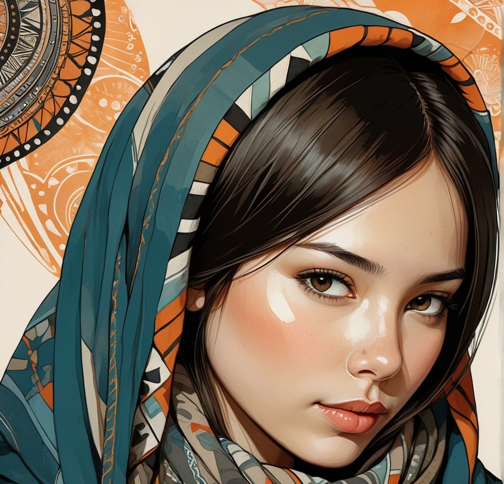 Headshot portraiture, digital painting, aleut clothing with intricate patterns, folk art, american primitive art by Mattias Adolfsson and Russ Mills, embodiment by Man Ray and Victo Ngai, cel-shaded, abstract post-avantgarde, luminosity and brightness adjustments, liminal, expressionistic realism, phong shading 1.3, texture mapping 1.3, displacement mapping 1.1, raytraced shadows 1.3, diffused reflections, watercoloring akin to alt-cinema visuals, stylized youthful female with scarf, visible textures, focused, blurry background, unique, zentangle patterns intertwined on contouring reminiscent of Gustav Klimt, middle-american folk art reminiscence, mulit-layerd eyes, multi-layered folk-art akin to embedded patterns blending elements of surrealism and mola folk-art. shimmering reflections enhancing details, delicate swirls and geometric shapes entwined by Man Ray, warm orange gradients merging seamlessly, gold, bronze, earthy tones for ornate and decorative elements, line-art details adorning the composition, fauvistic vibrant designs, magical, complex coloring in hues, plasmatic hatchings, scratched edges, cel-shaded style, Henri de Toulouse-Lautrec influence, Bloom-Effect, interpolated, subsurface scattering, casually textured layers, anti-aliasing, deep scale and perspective, slightly painterly elements, lean gradient inkings, vivid glossy textures, HDR, blurred watercoloring, airbrush effect, Raytraced shadows, divisionism techniques, luminism, sfumato-effect,