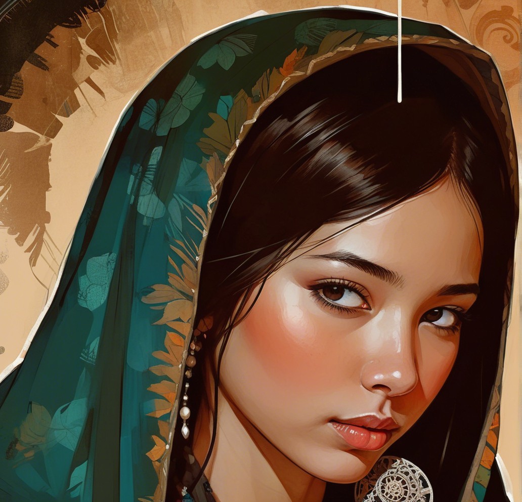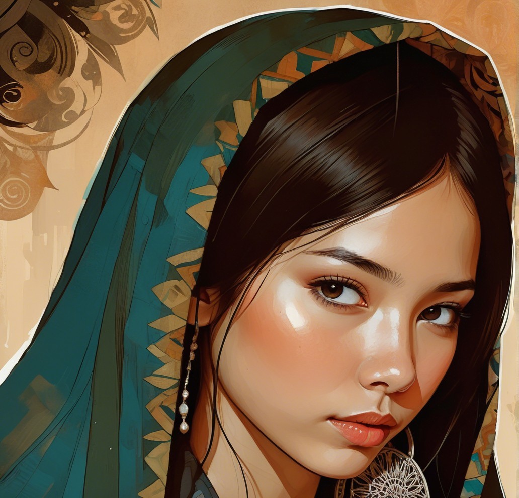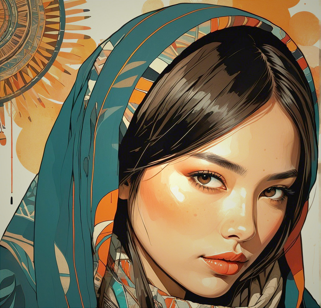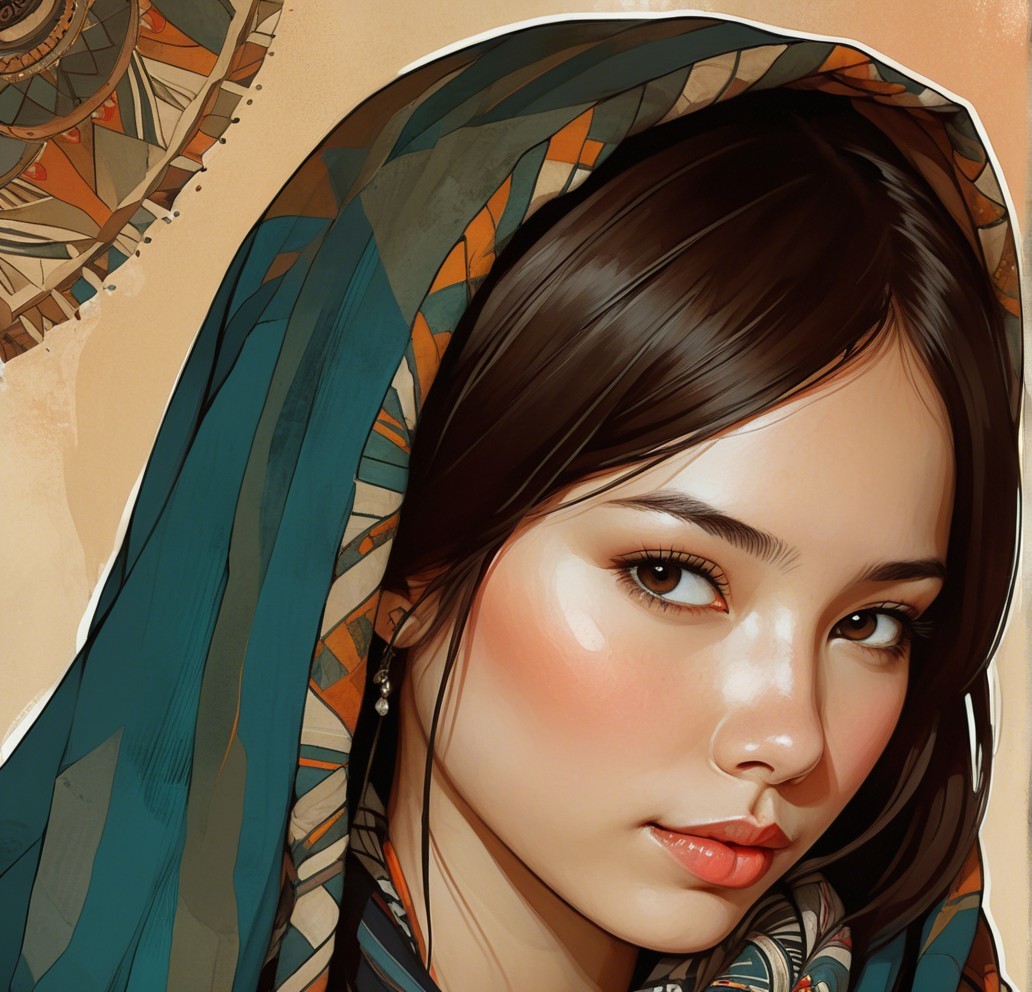 Headshot portraiture, digital painting, aleut clothing with intricate patterns, folk art, american primitive art by Mattias Adolfsson and Russ Mills, embodiment by Man Ray and Victo Ngai, cel-shaded, abstract post-avantgarde, luminosity and brightness adjustments, liminal, expressionistic realism, phong shading 1.3, texture mapping 1.3, displacement mapping 1.1, raytraced shadows 1.3, diffused reflections, watercoloring akin to alt-cinema visuals, stylized youthful female with scarf, visible textures, focused, blurry background, unique, zentangle patterns intertwined on contouring reminiscent of Gustav Klimt, middle-american folk art reminiscence, mulit-layerd eyes, multi-layered folk-art akin to embedded patterns blending elements of surrealism and mola folk-art. shimmering reflections enhancing details, delicate swirls and geometric shapes entwined by Man Ray, warm orange gradients merging seamlessly, gold, bronze, earthy tones for ornate and decorative elements, line-art details adorning the composition, fauvistic vibrant designs, magical, complex coloring in hues, plasmatic hatchings, scratched edges, cel-shaded style, Henri de Toulouse-Lautrec influence, Bloom-Effect, interpolated, subsurface scattering, casually textured layers, anti-aliasing, deep scale and perspective, slightly painterly elements, lean gradient inkings, vivid glossy textures, HDR, blurred watercoloring, airbrush effect, Raytraced shadows, divisionism techniques, luminism, sfumato-effect,