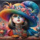 A whimsical girl with large eyes wears a colorful, flower-adorned hat. Vibrant creatures and fruits surround her, creating a fantastical, cheerful atmosphere full of imagination.