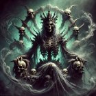 The image depicts a skeletal figure seated on a throne, adorned with horned embellishments and ornate jewelry. Surrounding it are ghostly figures, creating an eerie, dark fantasy atmosphere.