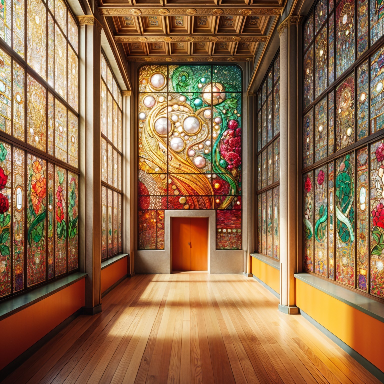 A stunning room features vibrant stained glass windows casting colorful light across polished wooden floors. Sunlight filters through, creating a warm, inviting atmosphere in this elegant space.