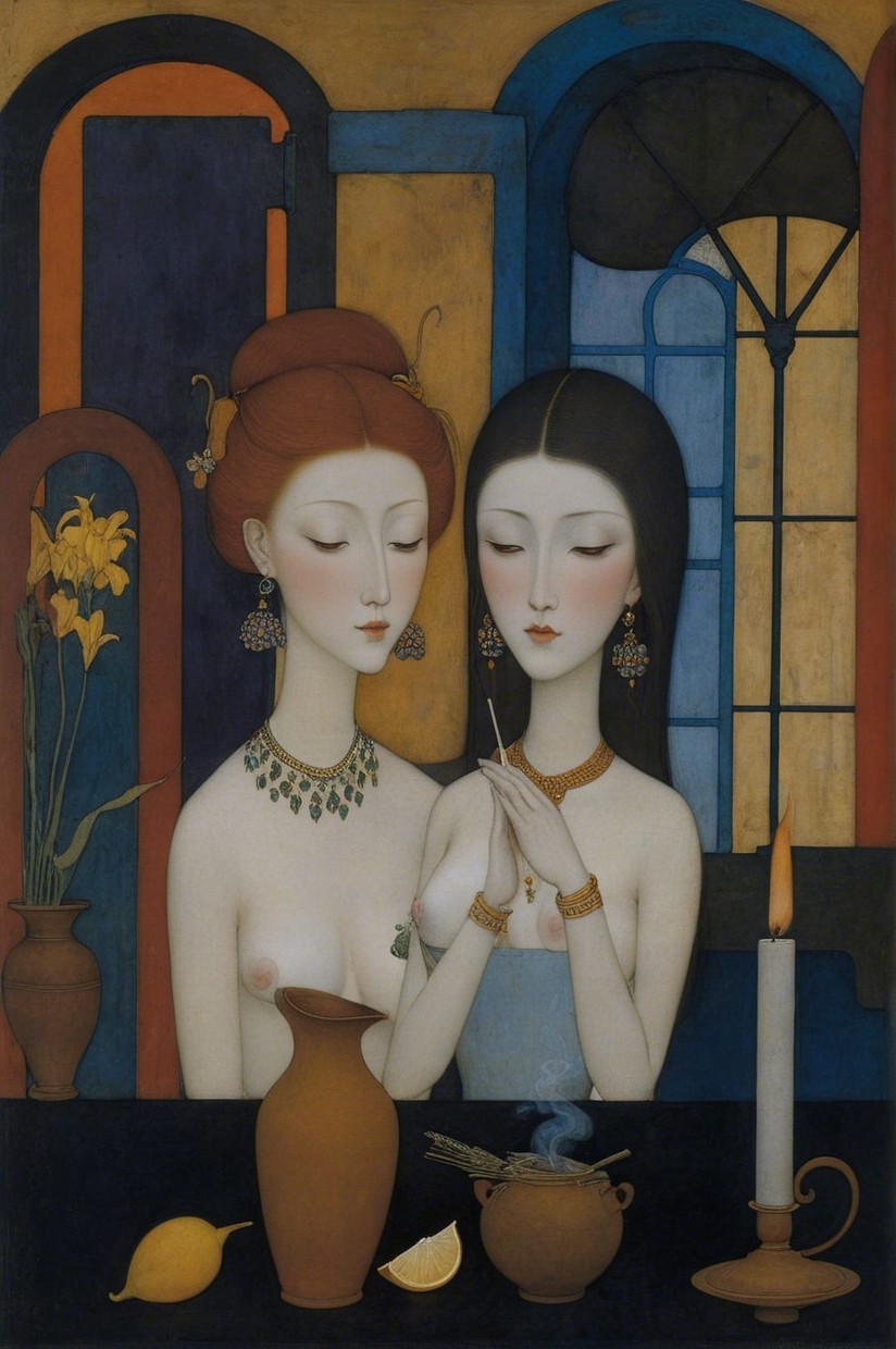 The artwork features two serene women with elegant hairstyles and intricate jewelry, surrounded by rich colors and soft lighting. They share a moment, with delicate flowers and traditional objects nearby.