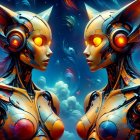 Futuristic robotic cats in a cosmic galaxy backdrop