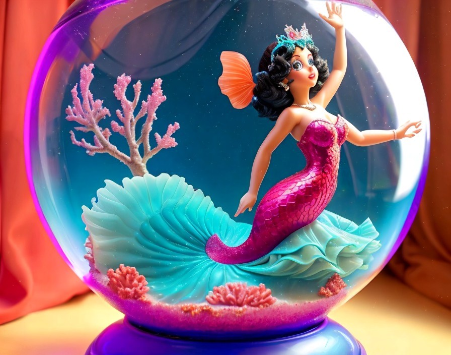 Prompt: "<lora:Strong Expression:1.2> Dive into the visually descriptive world of Betty Boop as a mermaid, with detailed renderings of her under the sea kingdom. From colorful coral reefs to mysterious shipwrecks, jellyfish, and sea turtle inside a snow globe"