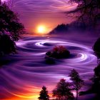 A stunning sunset casts vibrant hues of purple and orange over a tranquil seascape, where swirling currents blend with the water's surface, creating a mesmerizing, ethereal glow.