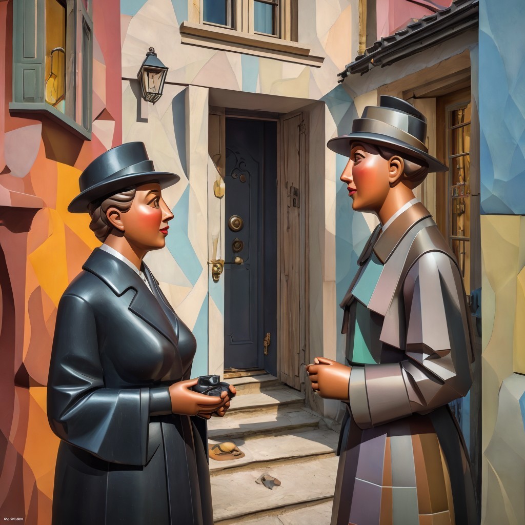 Two stylized figures in hats stand facing each other on a colorful, geometric street, beside a door with a lantern overhead.