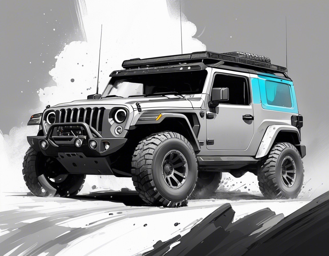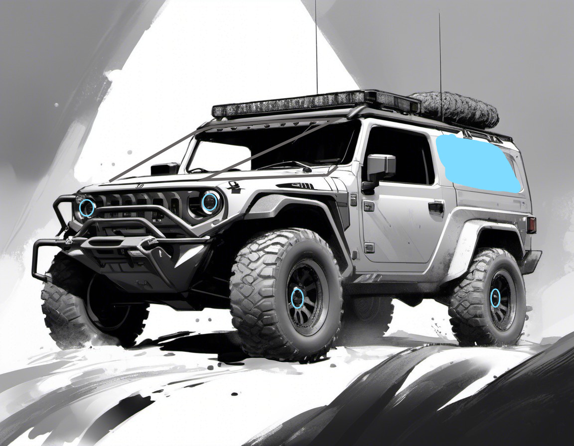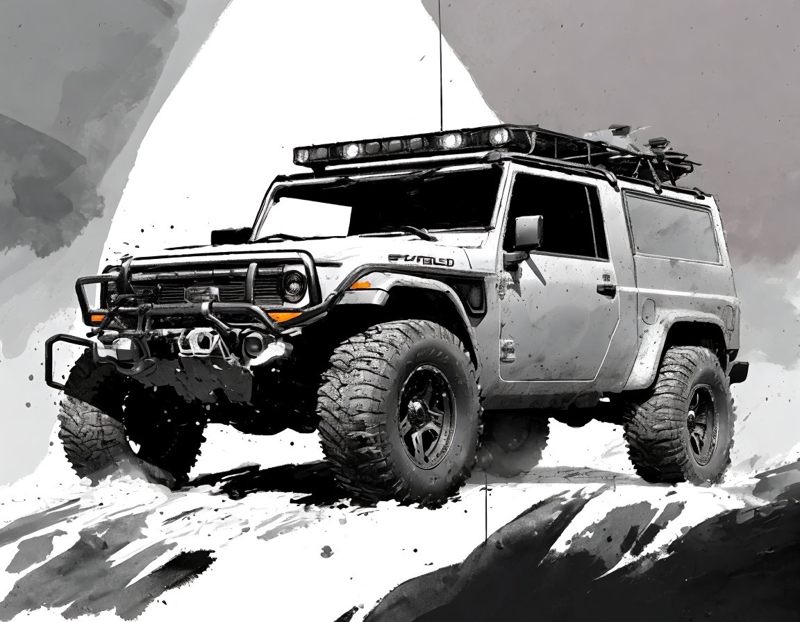 A rugged, high-tech SUV with a bulky design, oversized wheels, and various mounted equipment. Its sleek, modern aesthetic features a bold color contrast against a dynamic, abstract background.