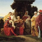 The image depicts four young women in elegant historical attire, playing stringed instruments in a serene landscape. Lush greenery and a village can be seen in the background, enhancing the scene's tranquility.