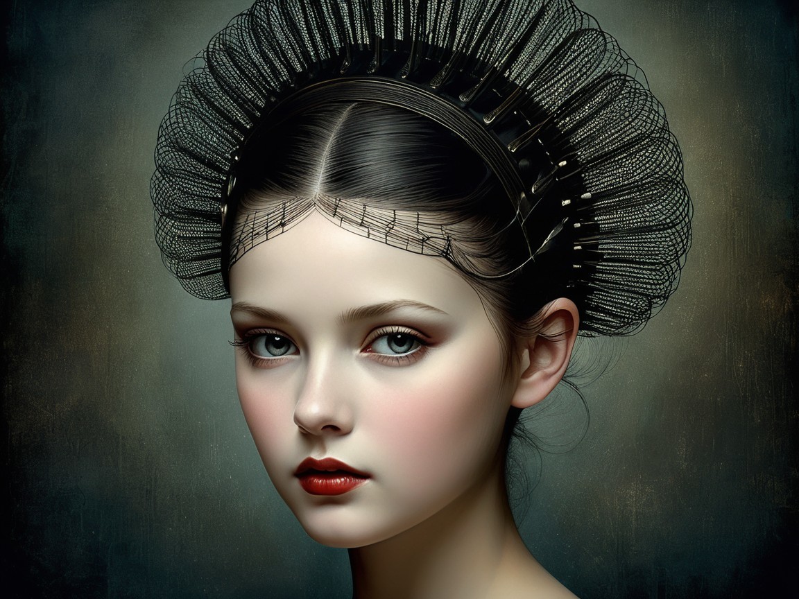 (Try from Aaron Gerschler) - A portrait of a young woman with striking features, soft skin, and delicate makeup. She wears a unique, ornate headpiece, set against a textured, muted background that enhances her elegance.