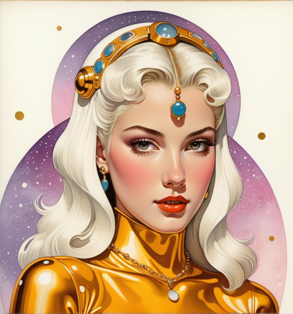 A glamorous figure with long, flowing white hair and a striking gold outfit. She wears a jeweled headpiece and necklace, set against a cosmic, colorful background that enhances her allure.