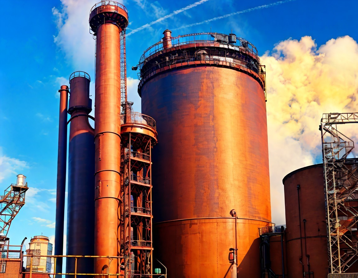 A striking industrial scene featuring large, shiny storage tanks surrounded by metallic piping. White vapor trails from jets crisscross the blue sky above, highlighting a vibrant energy infrastructure.