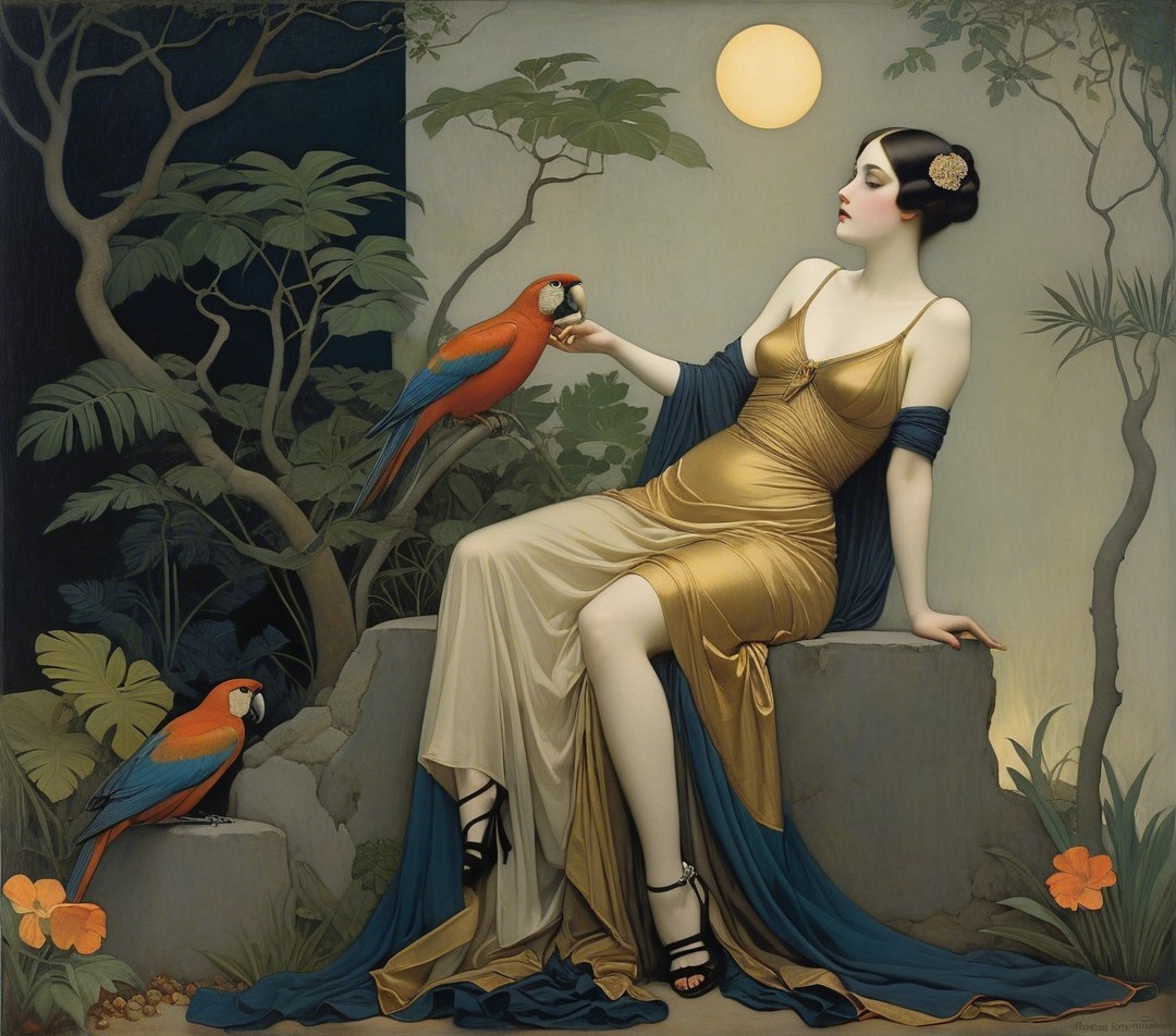 A woman in a flowing yellow dress sits gracefully among lush greenery, accompanied by vibrant scarlet macaws. The setting is serene, illuminated by a glowing full moon overhead.