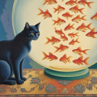Prompt: ((Christian Schloe, Tom Everhart, Cy Twombly, David Downton, El Anatsui, Philip Taaffe, Jan Toorop, Koloman Moser)) Cat regarding a giant spherical glass bowl of goldfish.