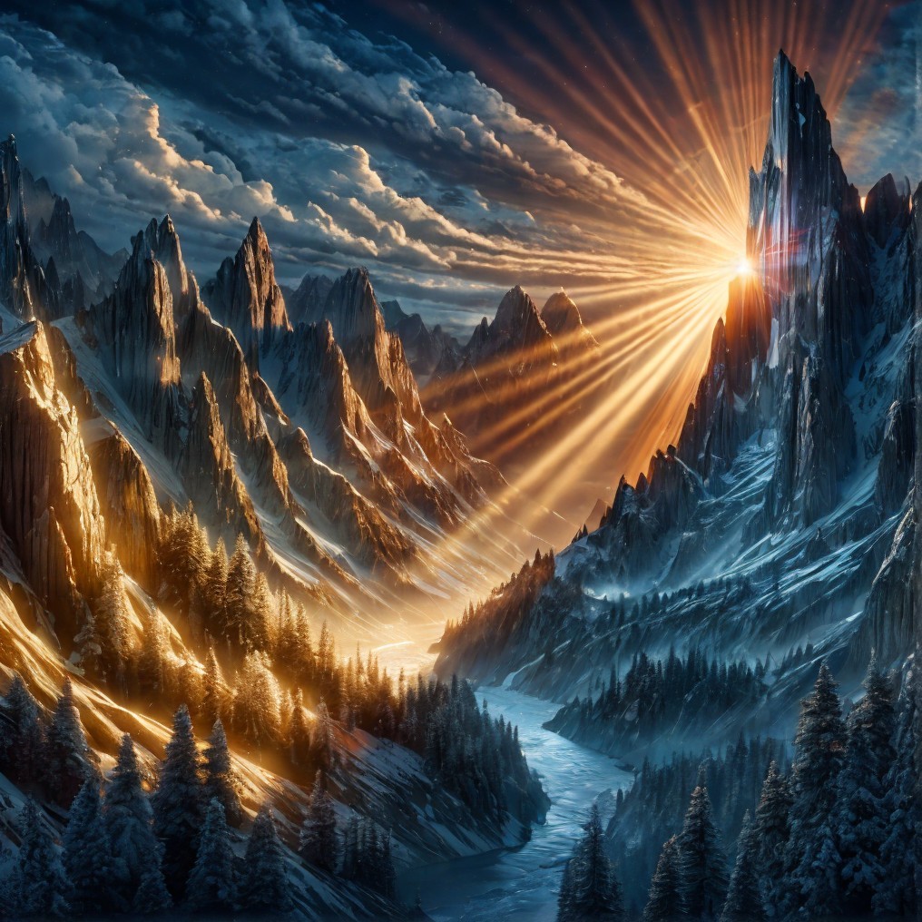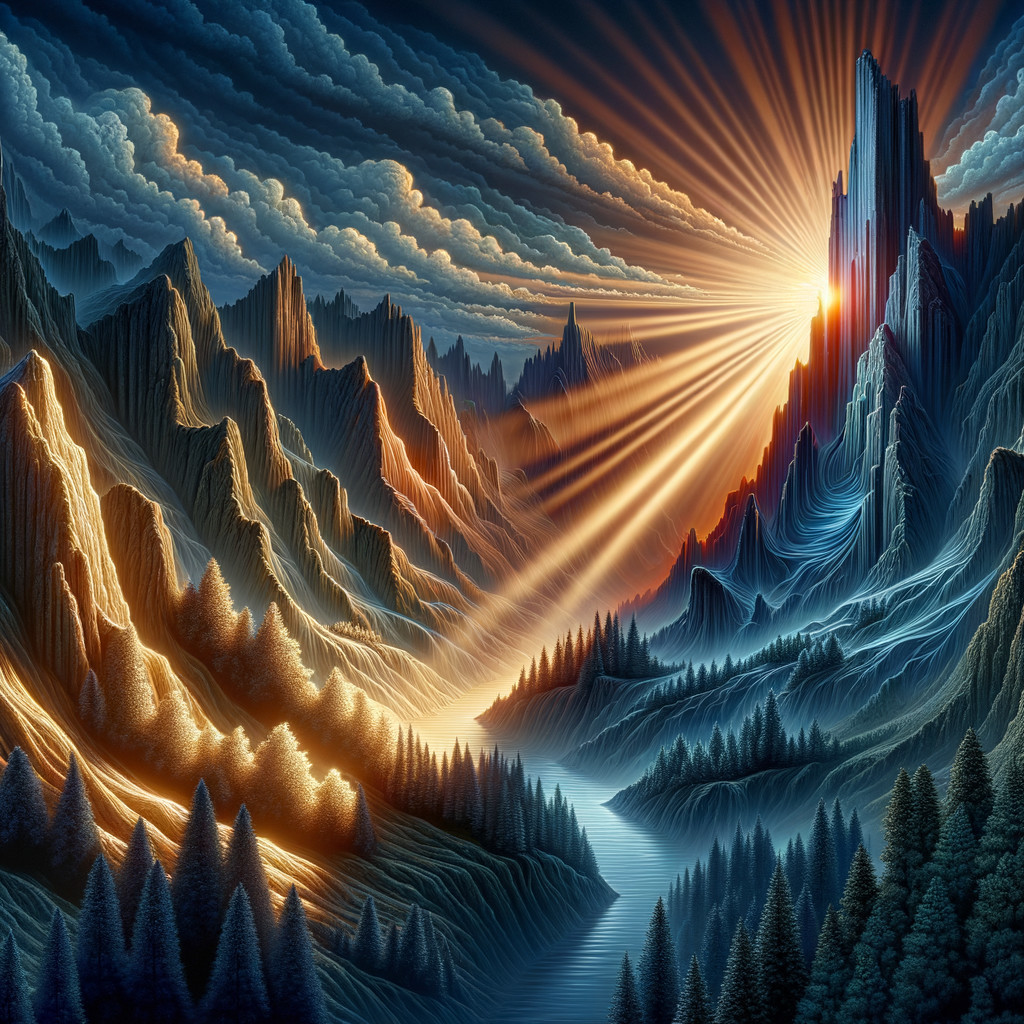 Prompt: "a majestic mountain landscape during dusk. The focal point is a radiant beam of light piercing through a narrow opening in the mountain, illuminating its rugged textures and casting an ethereal glow on the surrounding scenery. The atmosphere is imbued with a sense of mystique and serenity, highlighting the interplay of light and shadow. Incorporate a rich palette of twilight hues to enhance the dramatic effect of the light and to bring out the intricate details of the mountain's surface."