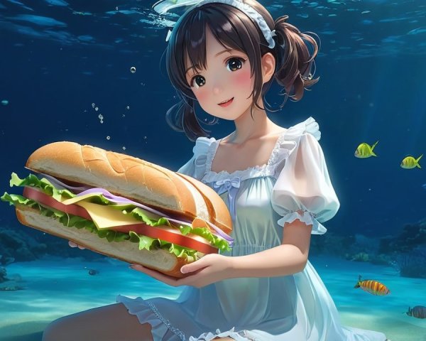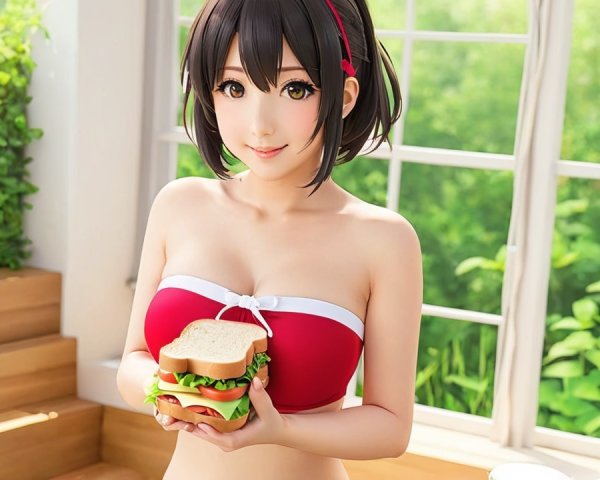 A charming anime character showcases a vibrant strapless swimsuit, exuding a playful and fun vibe. Her cheerful expression and colorful design create a captivating and whimsical summer atmosphere.