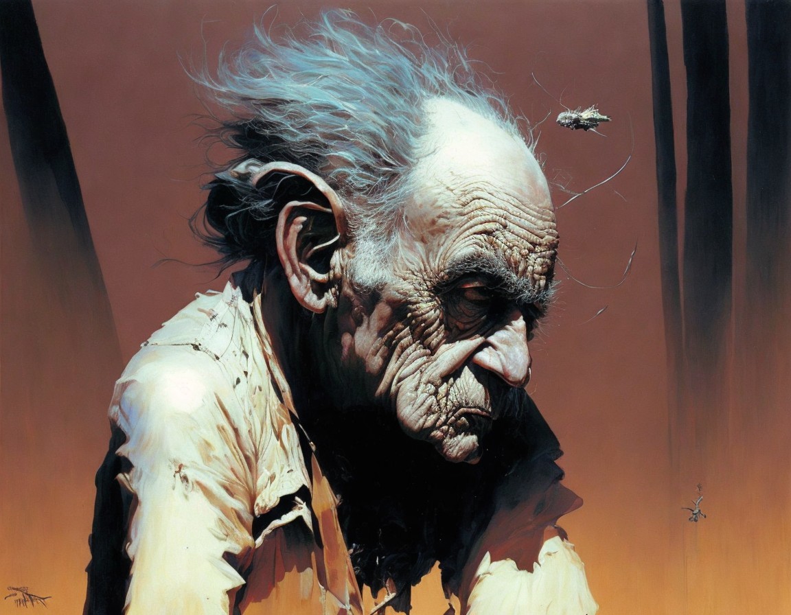 Elderly Man with Melancholic Expression and Surreal Background