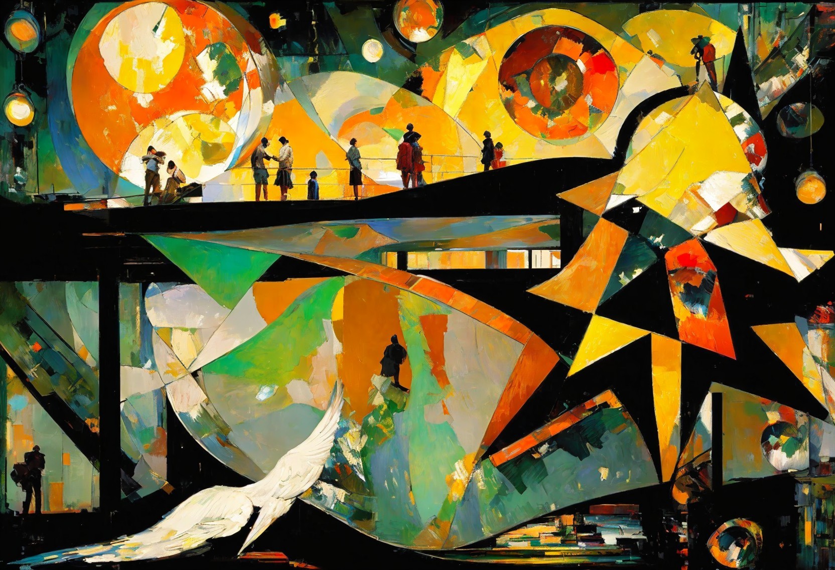A vibrant, abstract art piece intertwining human silhouettes, geometric shapes, water elements, and celestial bodies in a dynamic, surreal composition.