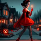 A whimsical scene of a woman in a red and black dress, striking a pose on a cobblestone street with carved pumpkins and a glowing full moon in a quaint village setting.